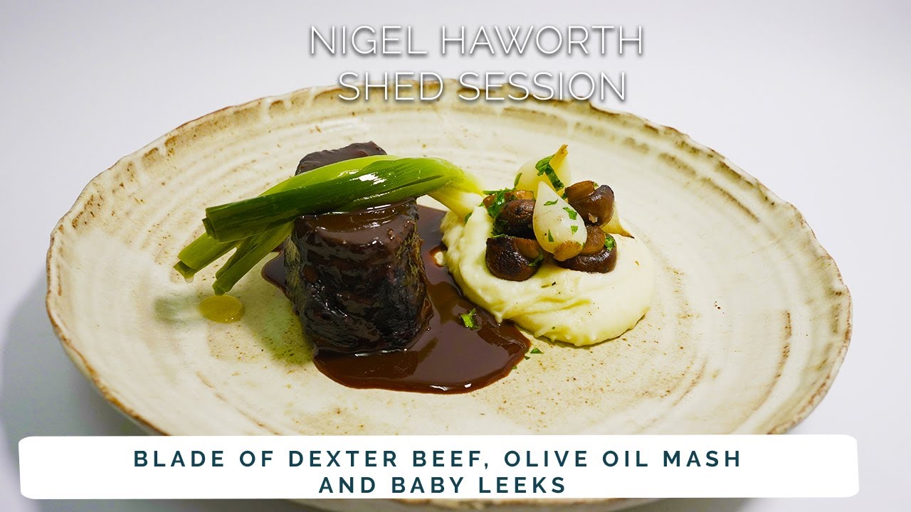 BLADE OF DEXTER BEEF, OLIVE OIL MASH, BABY LEEKS.