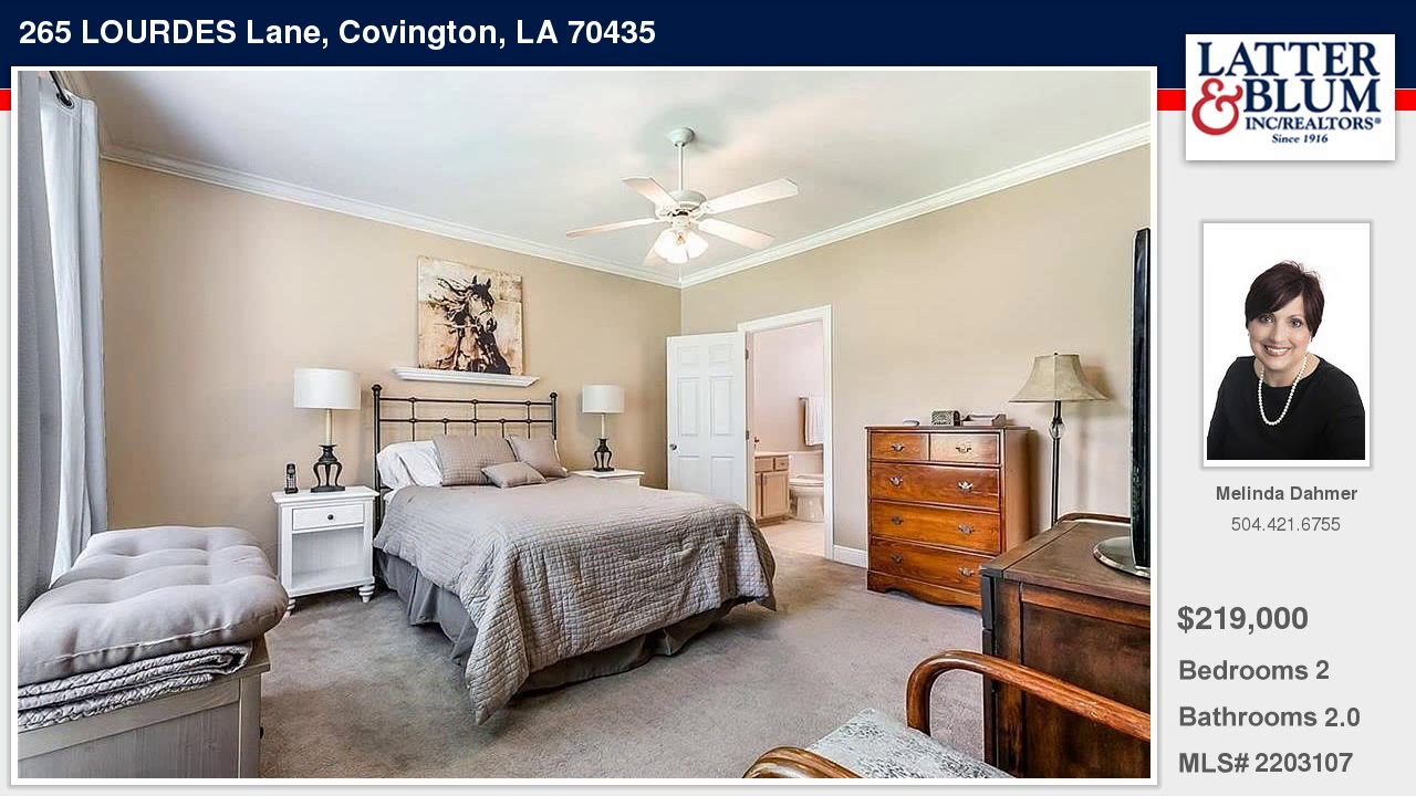265 LOURDES Lane Covington Louisiana Homes for Sale | www.latter-blum.com | Melinda Dahmer with Latter & Blum Companies | See full property details at | A must see! French Country design, private courtyard w/ breathtaking views overlooking green space & pond. Wood floors in living room w/fireplace & built-in bookshelves. Master suite w/ large bathroom & walk-in closet. Grab bars in bathrooms; easy access into shower. Efficient kitchen w/ lots of cabinets, Corian counters & lg pantry. Formal dining area w/ French doors to small patio. Dbl car garage w/ opener. Security & Sprinkler System. Age-Restricted Community. Preferred Flood Zone C.