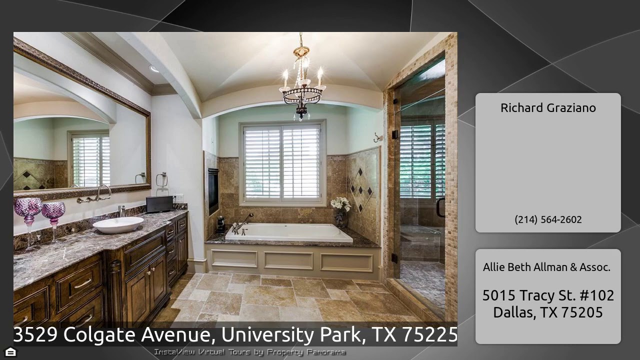 The Virtual Tour for the property at 3529 Colgate Avenue, University Park, TX 75225 listed for $2,650,000: Other homes for sale by Richard Graziano of Allie Beth Allman & Assoc.: Exceptional size and value on one of the best blocks in University Park! This home boasts gorgeous light-filled spaces with elegant staircases, beautiful formals, crisp crown moldings and handsome study with full bath. The gourmet kitchen features Wolf appliances and spacious breakfast area that opens to the sizable family room lined with French doors. Downstairs media room and wet bar ideal for entertaining. …