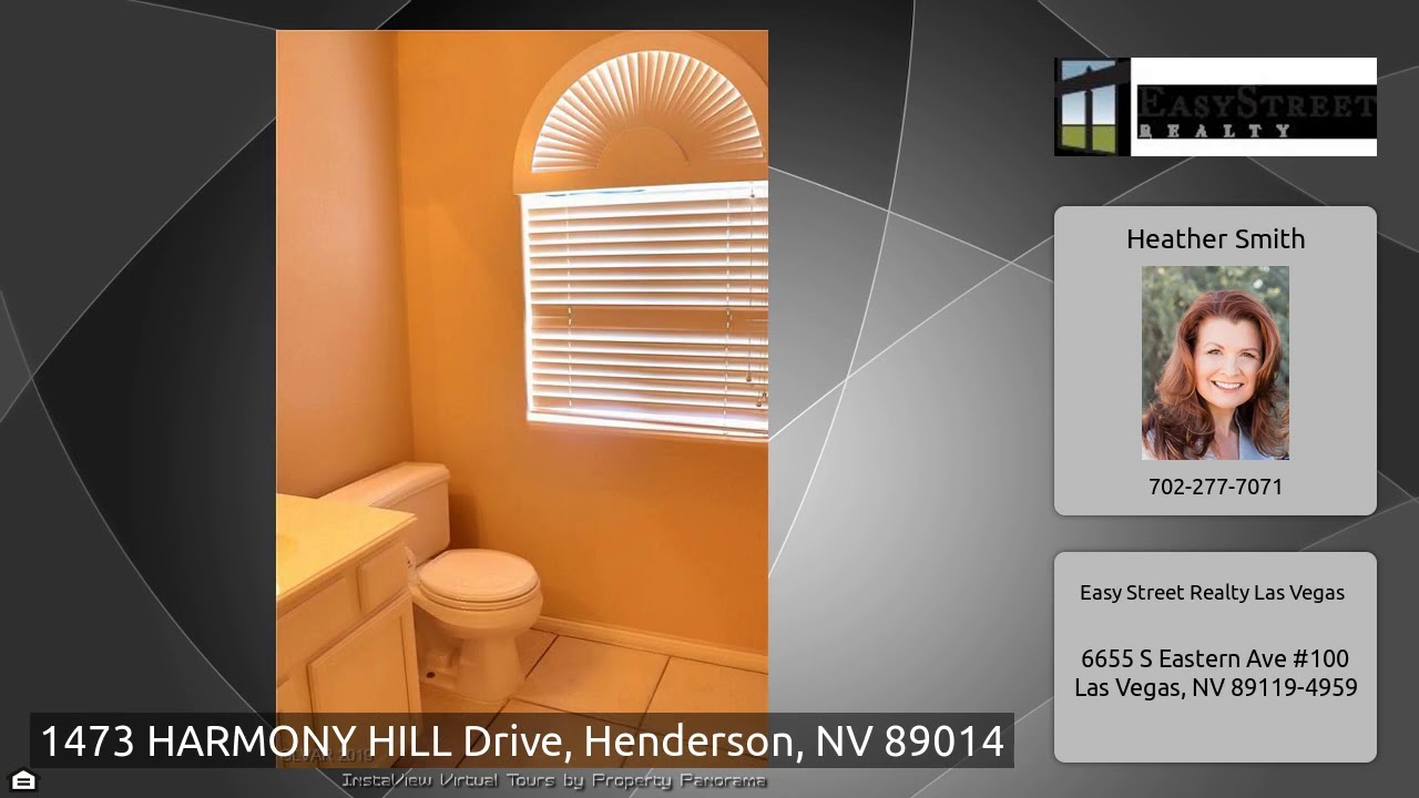 The Virtual Tour for the property at 1473 HARMONY HILL Drive, Henderson, NV 89014 listed for $285,000: Other homes for sale by Heather Smith of Easy Street Realty Las Vegas: Just Reduced! A lot of home for your money! HOA Dues $56.00 Quarterly! Spacious Home w/RV Gate & Parking! No Neighbors Behind! Living Room w/Vaulted Ceilings*Family Rm French Doors Open to Pool Sized Backyard. Kitchen Opens to Family Rm w/more French Doors off Dining Area to Backyard. Home Includes Refrigerator * Washer * Dryer. Master Bed Overlooks Backyard w/Walk-in Closet*Bed 2 & 3 Share Private Access Bath. Few Blocks …