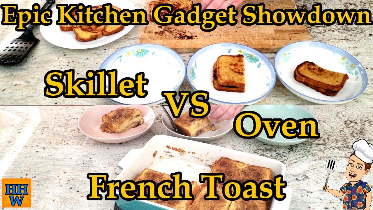 Inspired by the great Food Network Shows of Iron Chef and Beat Bobby Flay come a new style of YouTube Video from Happy Healthy Wife: Epic Kitchen Gadget Showdown. Today’s challenge is to see which Kitchen Gadget can make the better French Toast – the Skillet or a Conventional Electric Oven.