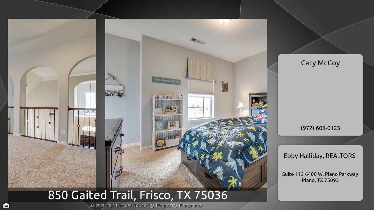 The Virtual Tour for the property at 850 Gaited Trail, Frisco, TX 75036 listed for $525,000: Other homes for sale by Cary McCoy of Ebby Halliday, REALTORS: Expect to be impressed! This Gorgeous home is loaded with upgrades. Study w-french doors. Soaring dining room ceiling. Gourmet Kitchen features oversized painted island, ss appliances, decorative hood cover, quartz counters and walk-in pantry. Living room has corner stone fireplace and a wall of windows overlooking backyard. Master suite boasts upgraded vanities soaking tub, separate tiled shower, and walk-in closet. Huge game room, 3 …