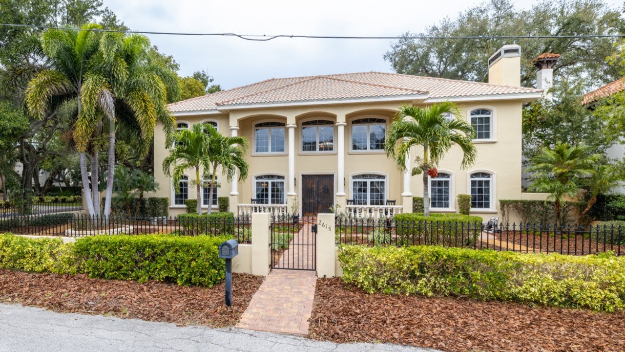 Splendid custom estate in the heart of South Tampa, enviable location on a corner/double lot on Bayshore, just a few mins walk to the bay. Flanked by palm trees and towering columns, gorgeous front garden, lovely walkways and fruit trees sprinkled around. Enter this magnificent home through double 8’ solid wood doors into a stunning two-story foyer, double wrought iron staircase wrapping a fountain. Featuring 5,480 SF, 5 Bed, 3 Baths, 2 half Baths, 3 Car Garage & large loft.
