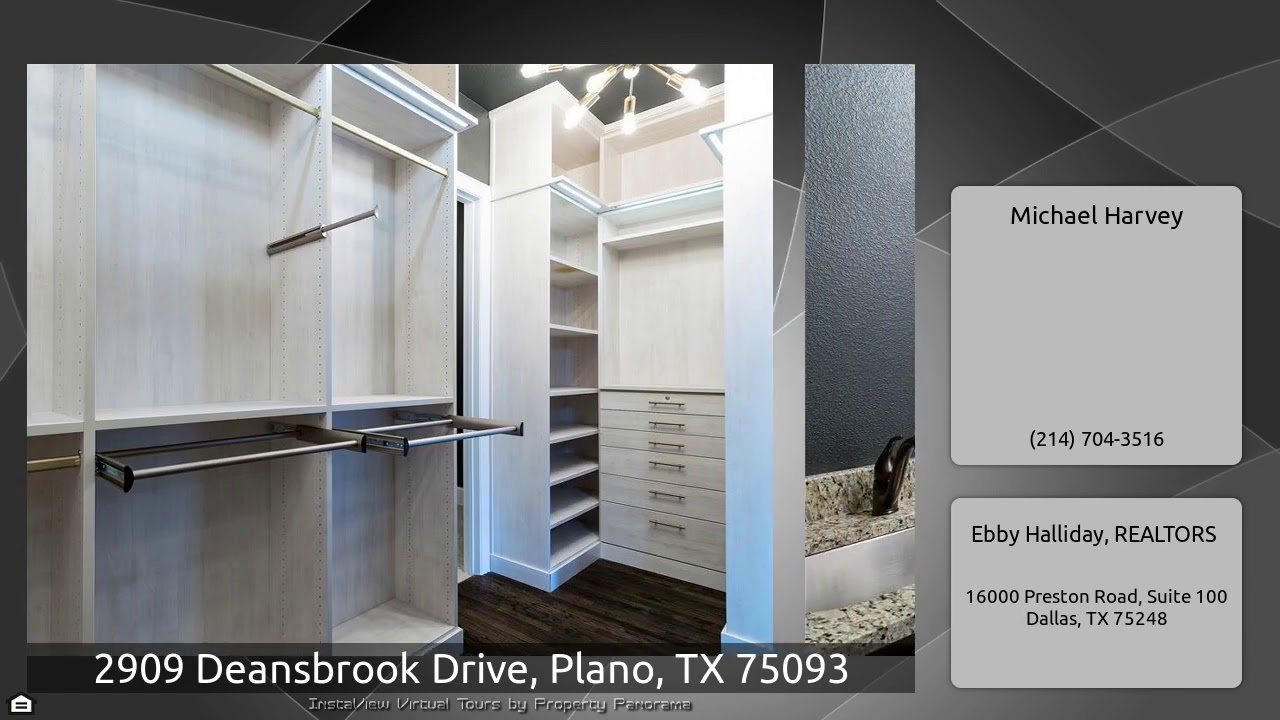 The Virtual Tour for the property at 2909 Deansbrook Drive, Plano, TX 75093 listed for $579,000: Other homes for sale by Michael Harvey of Ebby Halliday, REALTORS: Recent construction in West Plano under $600,000! Immaculate home has hardwood flooring and electric blinds throughout. Gourmet kitchen with top of the line stainless-steel appliances, 6-burner gas cooktop, granite counters and a large island. Over 17K was spent on custom designed master closet. Downstairs office boasts a coffered ceiling, French doors and is ideal for working from home. Kitchen opens to family room with soaring …
