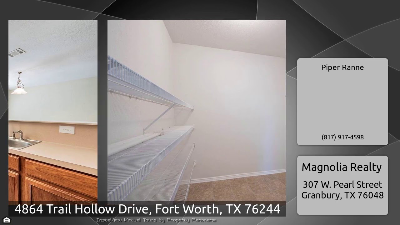 The Virtual Tour for the property at 4864 Trail Hollow Drive, Fort Worth, TX 76244 listed for $239,000: Other homes for sale by Piper Ranne of Magnolia Realty: Great family home located in very desirable Bear Creek Vista and Keller ISD. Also conveniently located near Fort Worth Alliance with plenty of shopping and dining. Split bedroom design with master and two other bedrooms on opposite side of the home. Great kitchen with eat in bar overlooking dining room with brand new French doors giving lots of natural light. Plenty of storage with walk-in closets in all the bedrooms and a spacious …