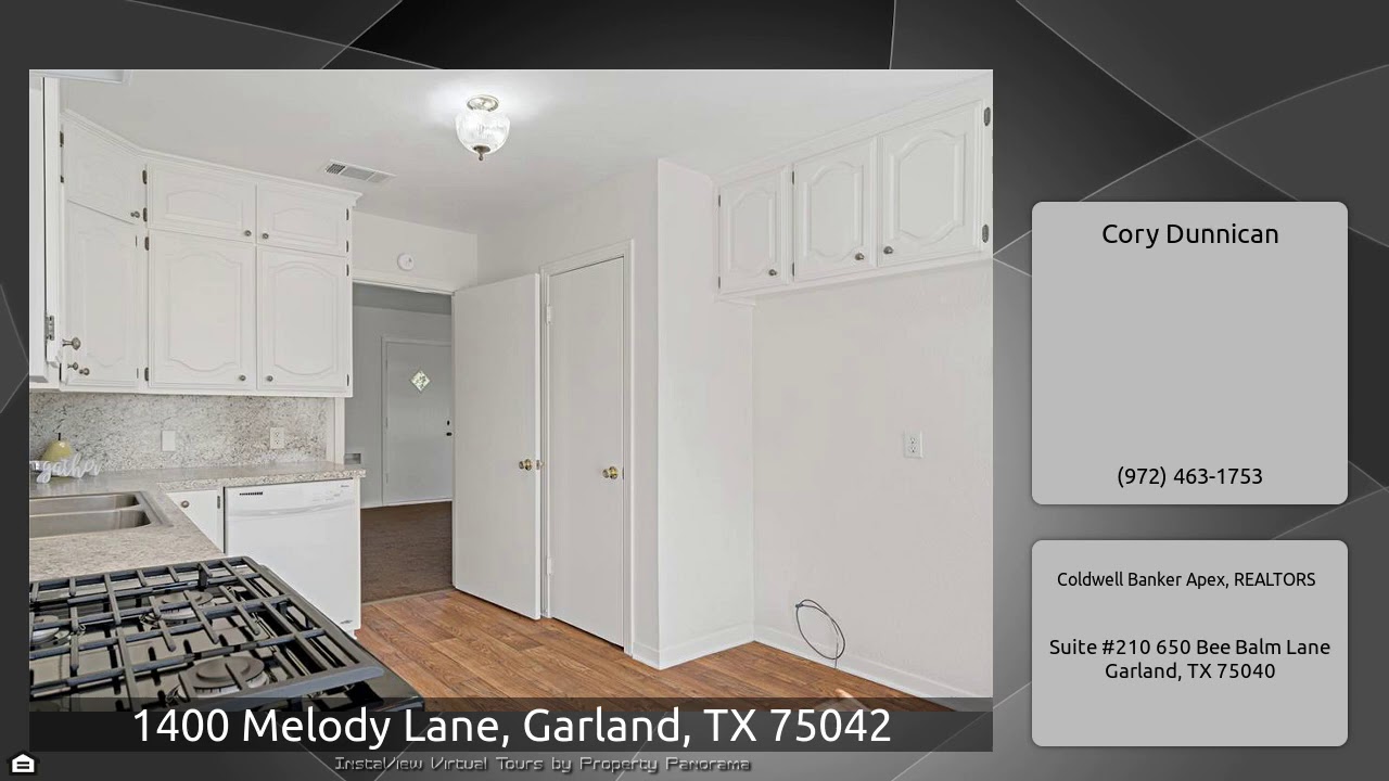 The Virtual Tour for the property at 1400 Melody Lane, Garland, TX 75042 listed for $205,000: Other homes for sale by Cory Dunnican of Coldwell Banker Apex, REALTORS: Updated single story on a corner lot with over .34 acres in the heart of Garland. Established neighborhoods with mature trees and large lots. Refinished Hardwood flooring, spacious kitchen with stainless range and updated countertops. Classic 1950's tile in full bath with updated vanity and built-in linen storage. Two living areas, a dining area and big bedrooms. French doors in second living area open to a large backyard with …