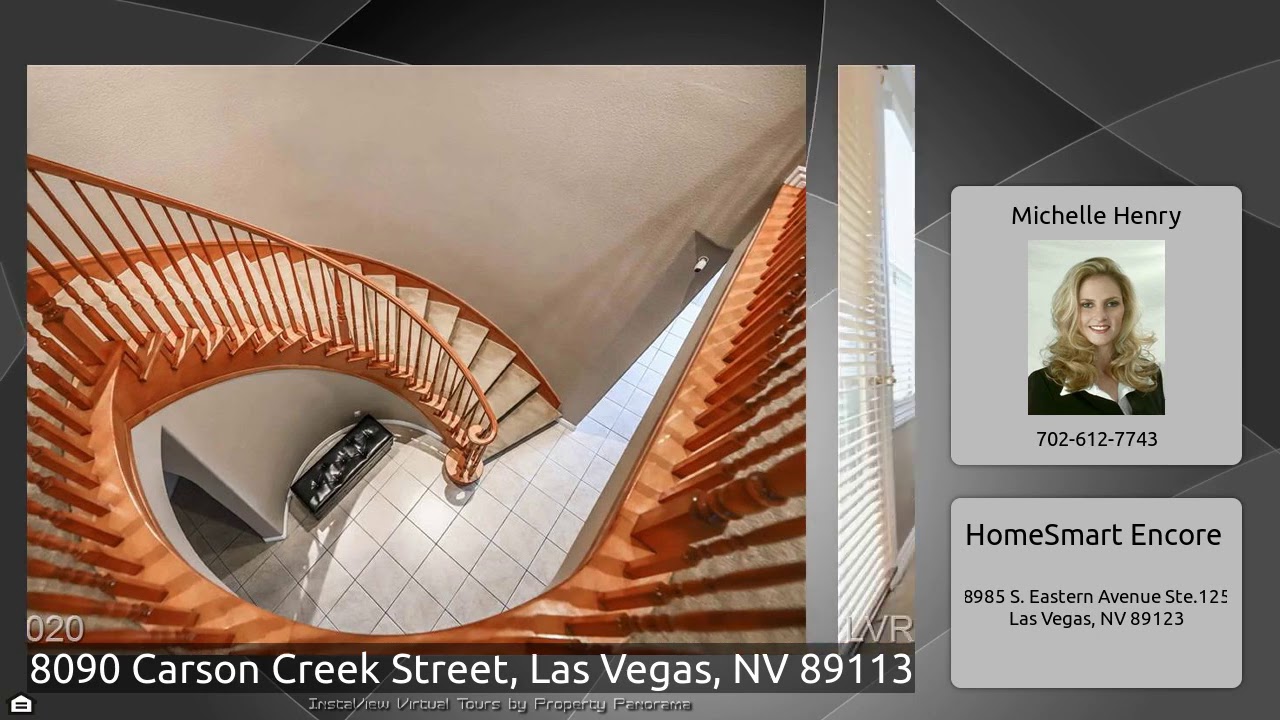 The Virtual Tour for the property at 8090 Carson Creek Street, Las Vegas, NV 89113 listed for $654,900: Other homes for sale by Michelle Henry of HomeSmart Encore: Gorgeous and Spacious home with full BED and Bath downstairs. Gourmet kitchen with stainless steel appliances, Granite countertop, large island, walk-in pantry, and French doors open to the side yard. Large dining rm opens to the family rm with fireplace, downstairs den with french doors to the courtyard. Large living rm with access to Backyard Paradise with Solar heated Pool and Spa, built-in BBQ , Two bonus rms upstairs, and huge …