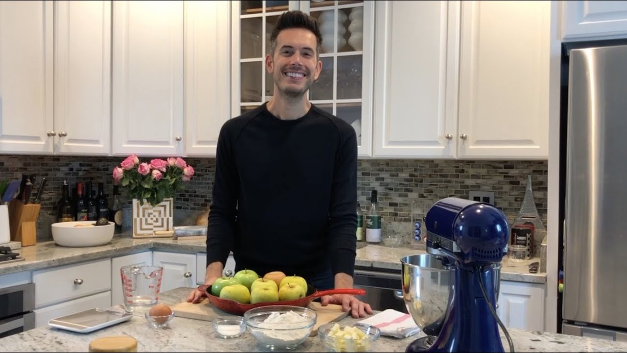 On a well-floured surface, roll out the chilled dough to be approx. ¼” thin and gently place pastry over the top of the apples. Tuck the dough neatly around the apples to “seal” them in. Roll excess dough hanging over the edge of the pan toward the center of the pan to create a lip around the parameter of the Tatin. With a knife, poke 6 holes in the top of your pastry to let steam escape during. See my video for the technique!