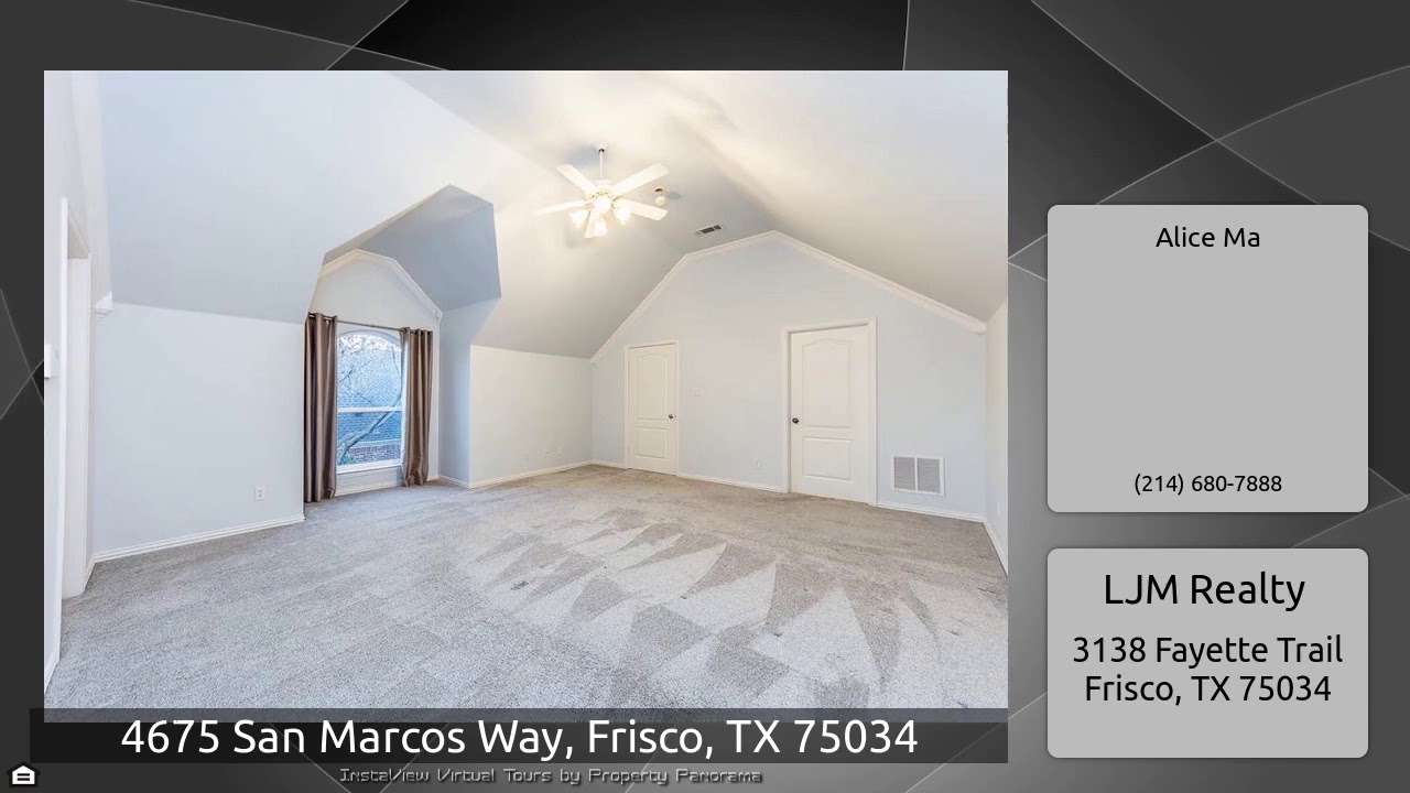 The Virtual Tour for the property at 4675 San Marcos Way, Frisco, TX 75034 listed for $439,000: Other homes for sale by Alice Ma of LJM Realty: In a gated Community with private lakes. Unique courtyard featuring fire pit, in-ground SPA & cleaning system. Two TRUE MASTERS, one down & one up with jetted tub, separate vanity & separate shower. 3 full & 2 half bath. French doors open to a good size study. Lots of built-ins in 3 living areas. Downstairs living room with beautiful cast stone fireplace. Gas cooktop, double oven & island in gourmet kitchen. Wrought iron baluster staircases. 2nd …