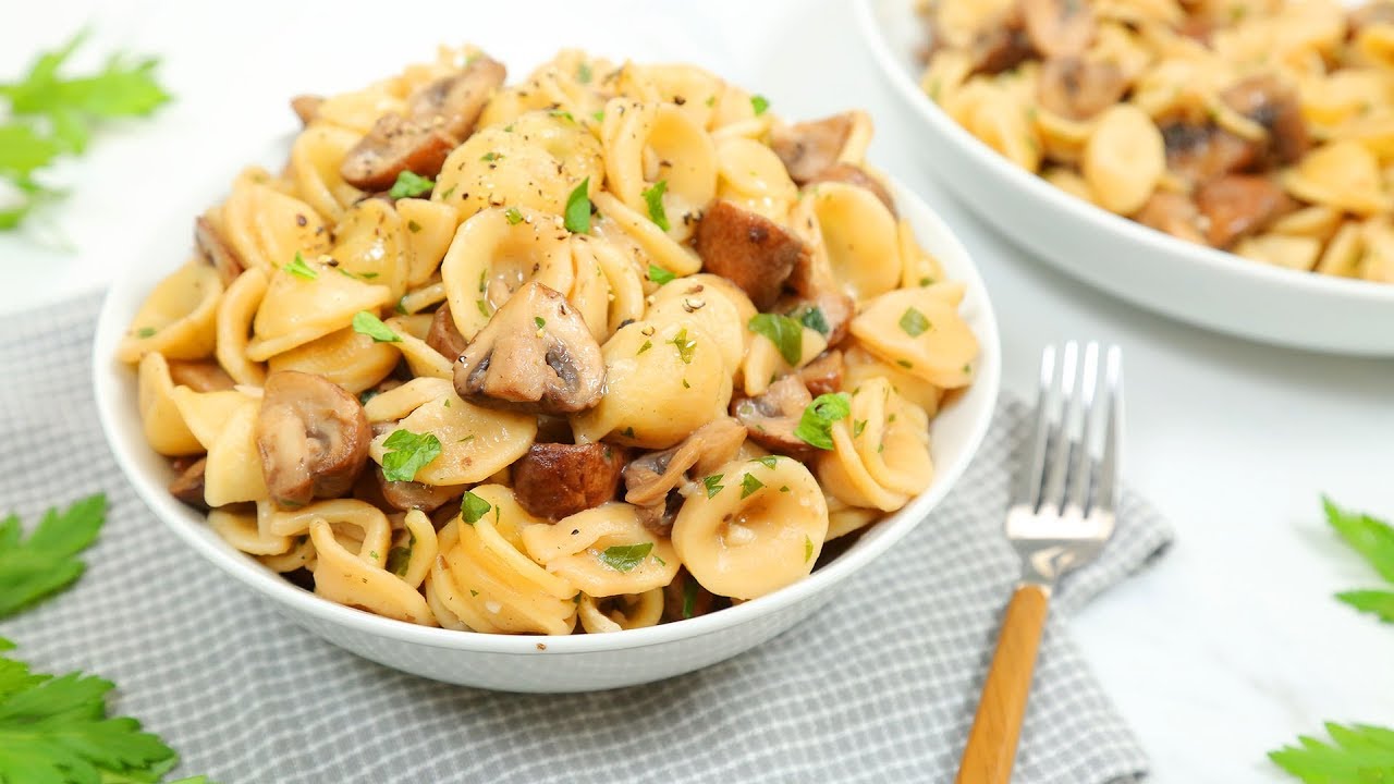 Meanwhile, in a large Dutch oven or pot, melt the butter over medium-high heat. Add the mushrooms and season them with salt and pepper to taste. Cook the mushrooms until they have released their moisture and begin to brown, about 5 minutes. Stir in the garlic and cook until it is fragrant, about 30 seconds. Stir in a couple of ladles full of the pasta water. Add the pasta to the skillet and cook until it is heated through. Once heated, Stir in the parsley.