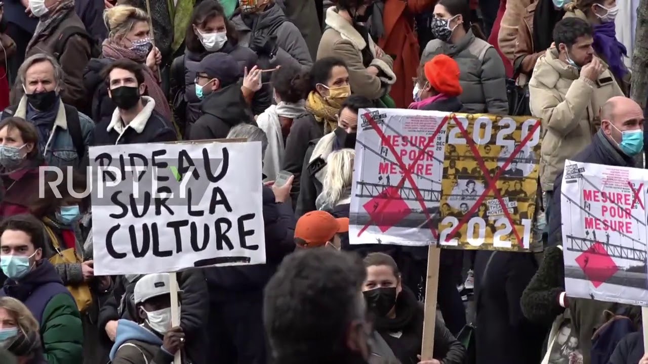 Entertainment industry employees gathered in Paris to protest against COVID-19 restrictions on Tuesday.