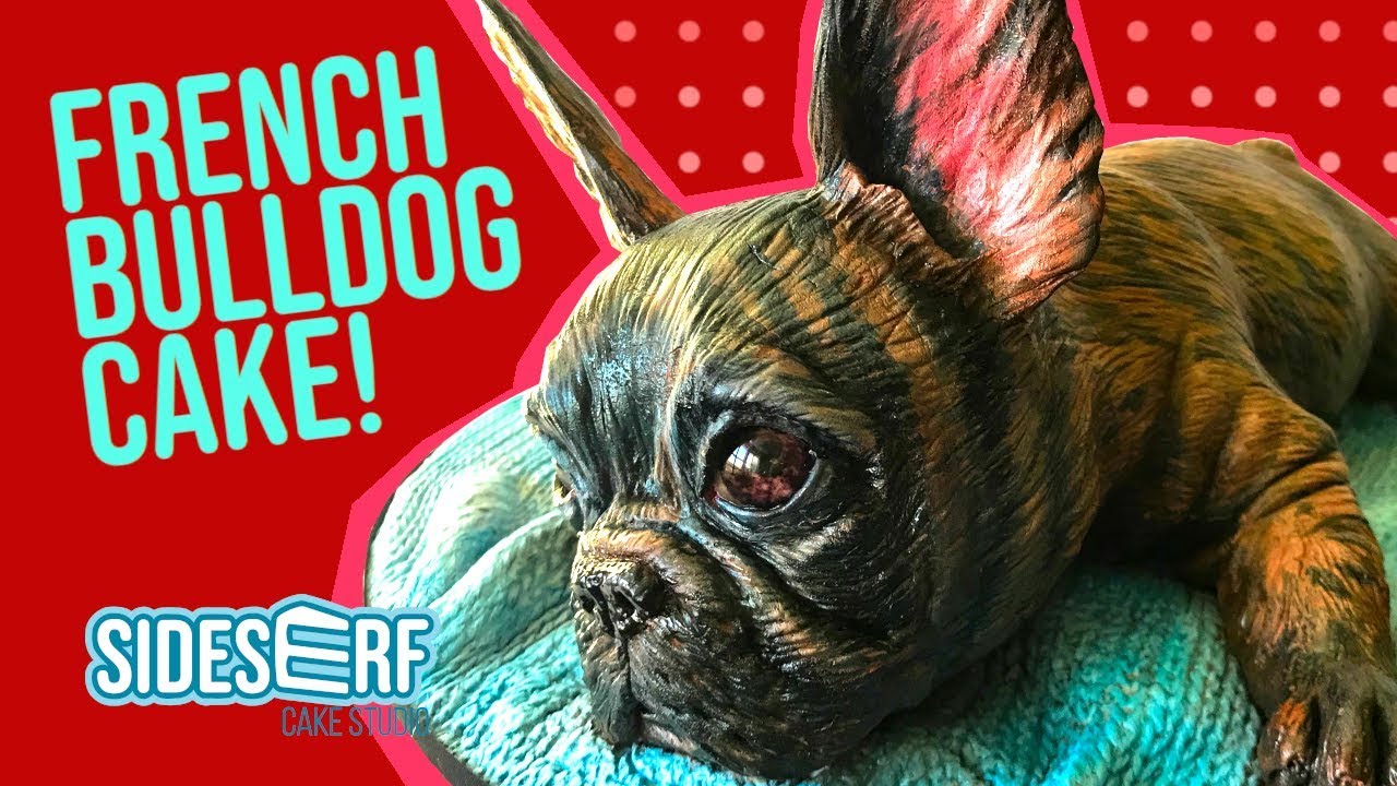 Realistic French Bulldog red velvet/cream cheese cake. Details sculpted in modeling chocolate!