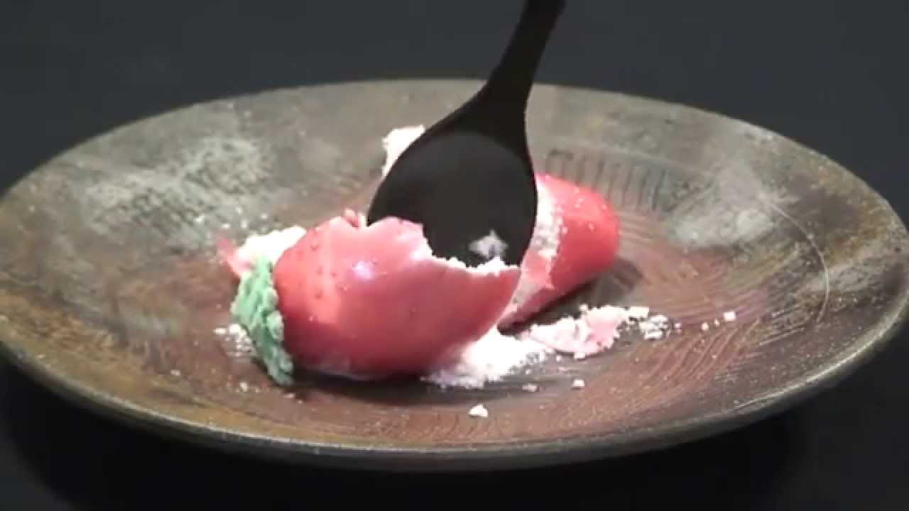 This is a molecular gastronomy strawberry-shaped toffee candy filled with powdered liquid nitrogen strawberry ice cream. This molecular gastronomy recipe is an adaptation of the signature dish “Minus-196° Candy Apple” by Seiji Yamamoto from his Tokyo restaurant Ryugin. Instead of apple form and ice cream, strawberry is used but the process is still the same.