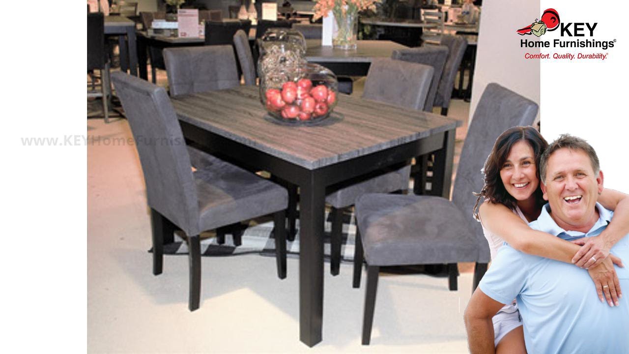 Crafted with a durable melamine surface, this dining set delivers high style with substance. Replicated wood grain top in dark charcoal raises the bar on casually cool dining. Sleek yet sturdy legs in a matte black finish heighten the contemporary appeal. Add the comfort of cushioned bar stools covered in a textured faux leather upholstery and you’ll find plenty of reasons to linger a little longer at mealtime.More DetailsCasual contemporary styling with a two-tone finish scheme. Table tops feature a durable Melamine surface with a replicated dark charcoal gray wood grain. Table bases, chair and counter stool frames are finished in a flat black color. Fully upholstered chair and counter stool is covered with a textured faux leather in a French black coloration. D161-225 chair dimensions: 17W x 22D x 38H. D161-223 chair dimensions: 19W x 22D x 39H.Set includes dining table and 4 upholstered bar stoolsTable made of wood and engineered woodTabletop surface made of melamine with replicated wood grain textureTwo-tone finish; dark charcoal gray and matte blackBarstools with French black faux leather upholstery with wood frame in matte black finishSeats 4Assembly requiredColor(s): Two-tone