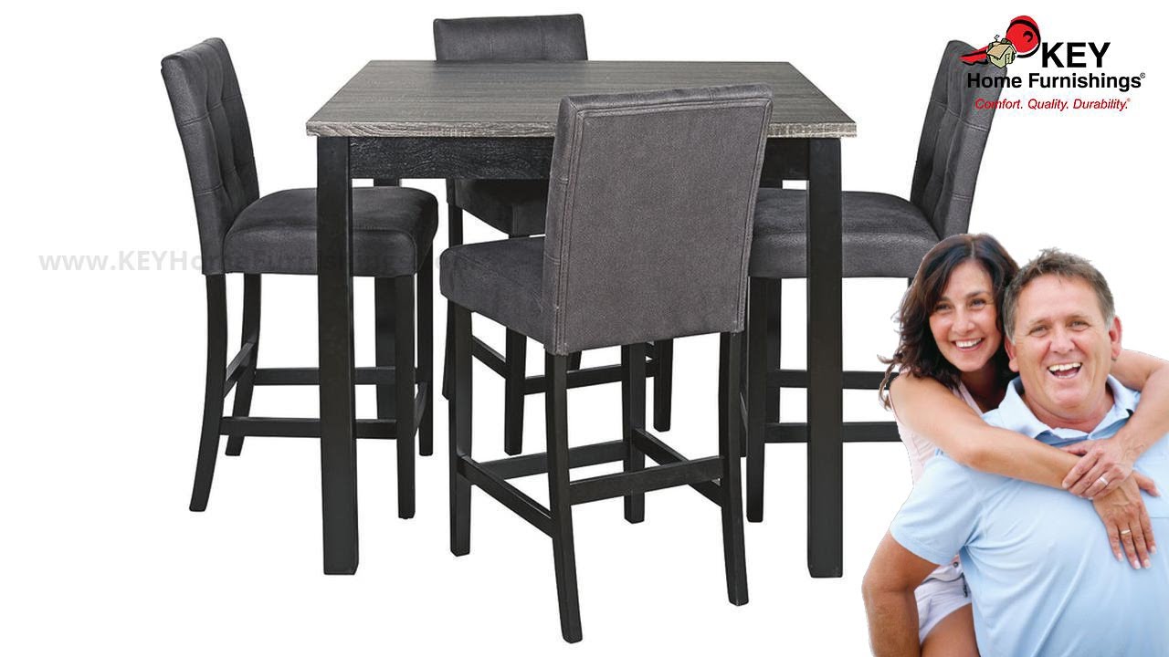 Crafted with a durable melamine surface, this counter-height dining set delivers high style with substance. Replicated wood grain top in dark charcoal raises the bar on casually cool dining. Sleek yet sturdy legs in a matte black finish heighten the contemporary appeal. Add the comfort of cushioned bar stools covered in a textured faux leather upholstery and you’ll find plenty of reasons to linger a little longer at mealtime.More DetailsCasual contemporary styling with a two-tone finish scheme. Table tops feature a durable Melamine surface with a replicated dark charcoal gray wood grain. Table bases, chair and counter stool frames are finished in a flat black color. Fully upholstered chair and counter stool is covered with a textured faux leather in a French black coloration. D161-225 chair dimensions: 17W x 22D x 38H. D161-223 chair dimensions: 19W x 22D x 39H.Set includes counter-height dining table and 4 upholstered bar stoolsTable made of wood and engineered woodTabletop surface made of melamine with replicated wood grain textureTwo-tone finish; dark charcoal gray and matte blackBarstools with French black faux leather upholstery with wood frame in matte black finishSeats 4Assembly requiredColor(s): Two-tone