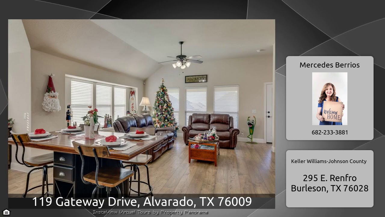 The Virtual Tour for the property at 119 Gateway Drive, Alvarado, TX 76009 listed for $252,000: Other homes for sale by Mercedes Berrios of Keller Williams-Johnson County: Stop searching and say good-bye to high electric bills!! Imagine yourself in this gorgeous 3 years old Bloomfield Home! Move-In Ready with easy access to I-35W. This home provides an open floor plan with a gourmet kitchen featuring granite countertops, built-in-Stainless Steel appliances, custom cabinets and a large island. Family Room infused with natural light and large Study with French Doors. Relax in your beautiful …