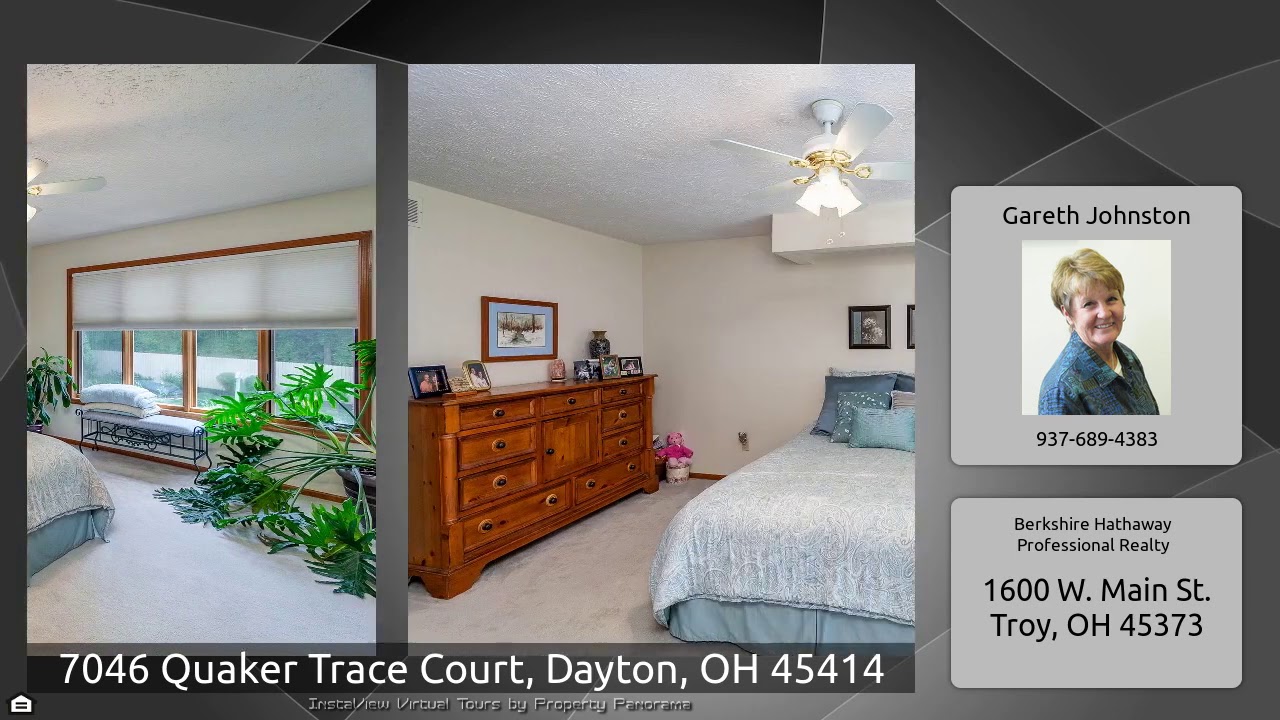 The Virtual Tour for the property at 7046 Quaker Trace Court, Dayton, OH 45414 listed for $379,000: Other homes for sale by Gareth Johnston of Berkshire Hathaway Professional Realty: Beautiful home on a gorgeous landscaped lot at the end of a quiet cul-de-sac. 2 story entry with leaded glass side lights and hardwood floors welcomes you to the inviting first floor area that features a cozy den/office with built in bookcases, french doors for privacy, formal dining area, kitchen with granite counters, wine cooler and large pantry, a separate eating area that has a great view of the manicured …