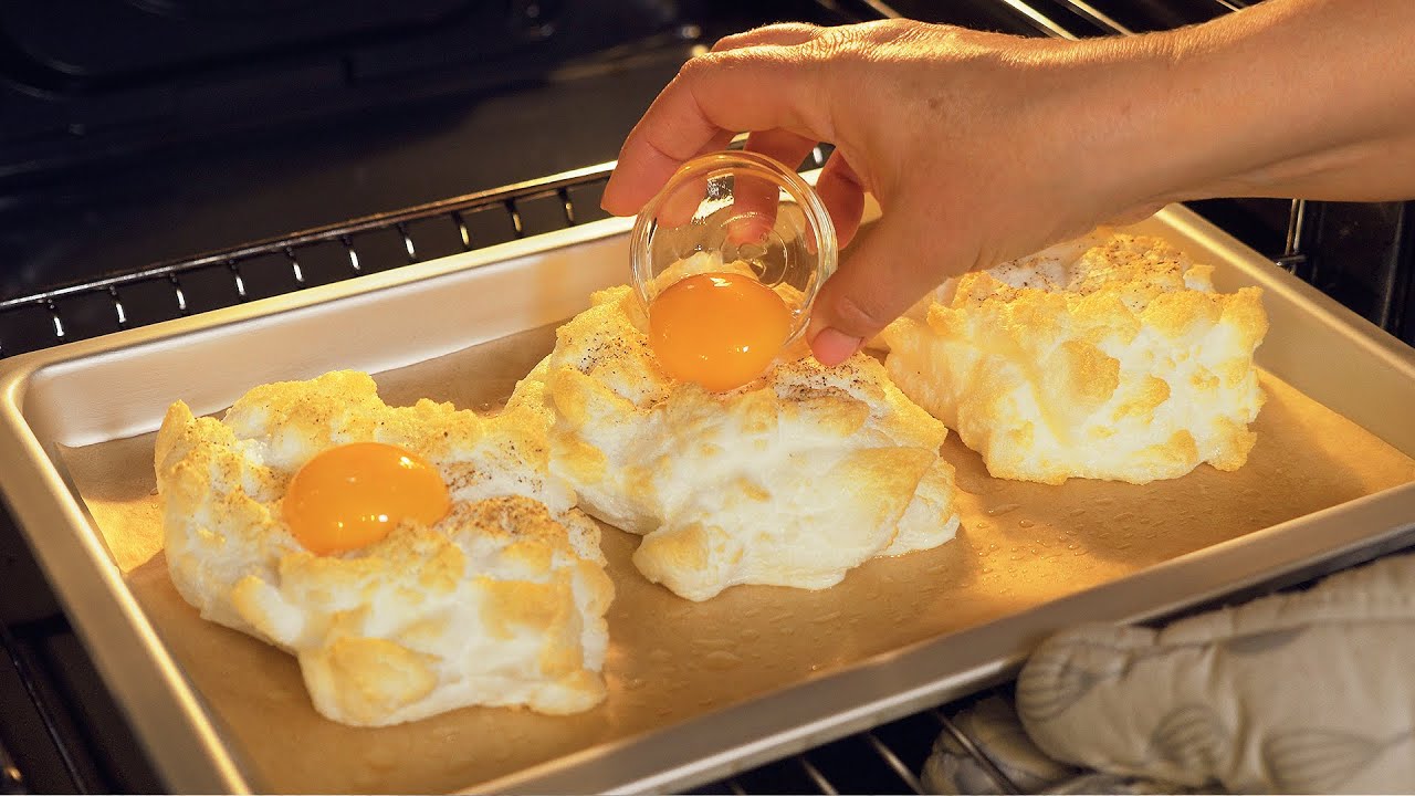 6. In 5 minutes place one yolk into each portion of whites and bake at 350°F /180°C for 3 minutes more.