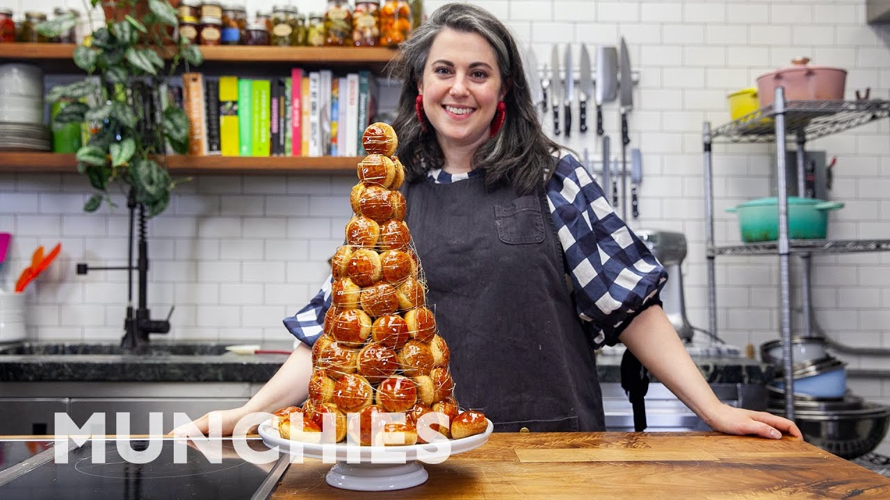 Claire Saffitz, author of the new cookbook “Dessert Person,” is in the Munchies Test Kitchen making the Eiffel Tower of pastries: croquembouche. This celebratory dessert is perfect for the holiday season– a tower of individual cream puffs coated in crunchy caramel. Claire breaks down each step of the croquembouche process, like making the cream puffs with choux pastry, topping them with craquelin, and filling them with a dark chocolate and creme fraiche cream. The individual puffs are dipped in caramel, assembled into a cone-shaped tower, and drizzled in caramel threads. The result is a pastry masterpiece. Check out the recipe here: to Munchies here: