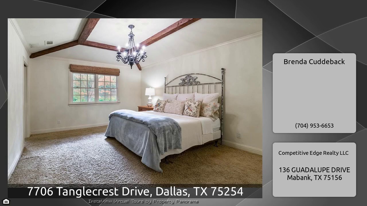 The Virtual Tour for the property at 7706 Tanglecrest Drive, Dallas, TX 75254 listed for $724,000: Other homes for sale by Brenda Cuddeback of Competitive Edge Realty LLC: NEW ROOF! NEW FRENCH LINEN INTERIOR PAINT. Gorgeous ranch home nestled in Northwood Hills neighborhood close to dining and DNT. Numerous upgrades include beautiful custom cabinets, hand scraped hardwood floors & BEAMS, exotic granite and marble in bathrooms. Luxurious Master Bath has a 6 foot jetted tub, dual head shower, large, walk in closet with custom shelving and drawers. Spacious game room just off the kitchen, mud …