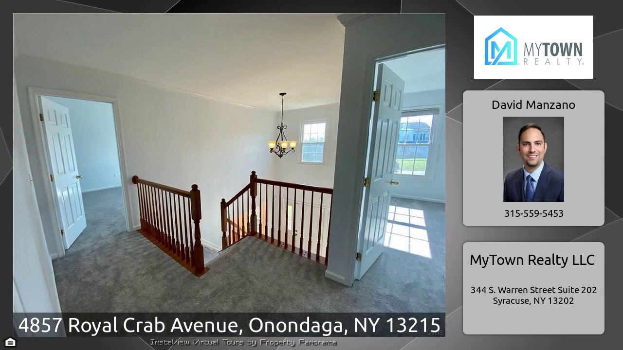 The Virtual Tour for the property at 4857 Royal Crab Avenue, Onondaga, NY 13215 listed for $269,900: Other homes for sale by David Manzano of MyTown Realty LLC: Spread out in this spacious majestic Trans-Colonial featuring 2-story foyer entry open to front office with French doors, large front living room to back formal dining room with side bay window. Bright kitchen with new LVT floors, new counter tops and ceramic back splash, open to eating area. Step down to family room with fireplace and double french doors to spacious vaulted sun room with access to upper deck overlooking fantastic in- …