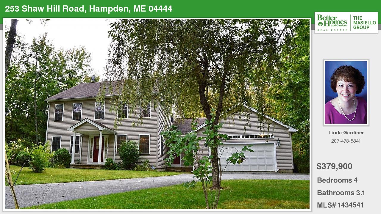 253 Shaw Hill Road Hampden Maine Homes for Sale | www.masiello.com | Linda Gardiner with Better Homes and Gardens Real Estate The Masiello Group | See full property details at | Meticulously maintained 4 BR 3.5 BA colonial on 5.9 acres. Gleaming hardwood floors in kitchen, LR, FR DR and baths, Spacious family room with gas fireplace leads to rear deck through brand new French doors. Very private back yard with picket fence for pets. Large finished rooms in basement for office, hobbies. or toys. First fl laundry and mudroom, eat-in kitchen with breakfast bar and plenty of room for a dining table. Dining room can be used for formal occasions or first fl office or play room. Attached 2-car garage. Central air on 2nd floor and air unit on first fl. Come and see what could be your new home! Hampden schools!