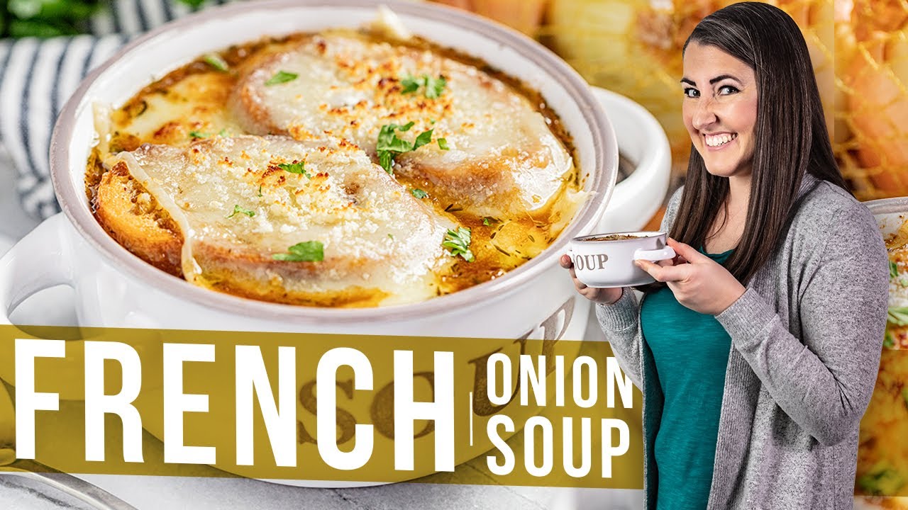French Onion Soup is made the classic way with a delicious caramelized onion soup topped with a toasted baguette and gooey melted Gruyere cheese. This soup is a restaurant favorite!