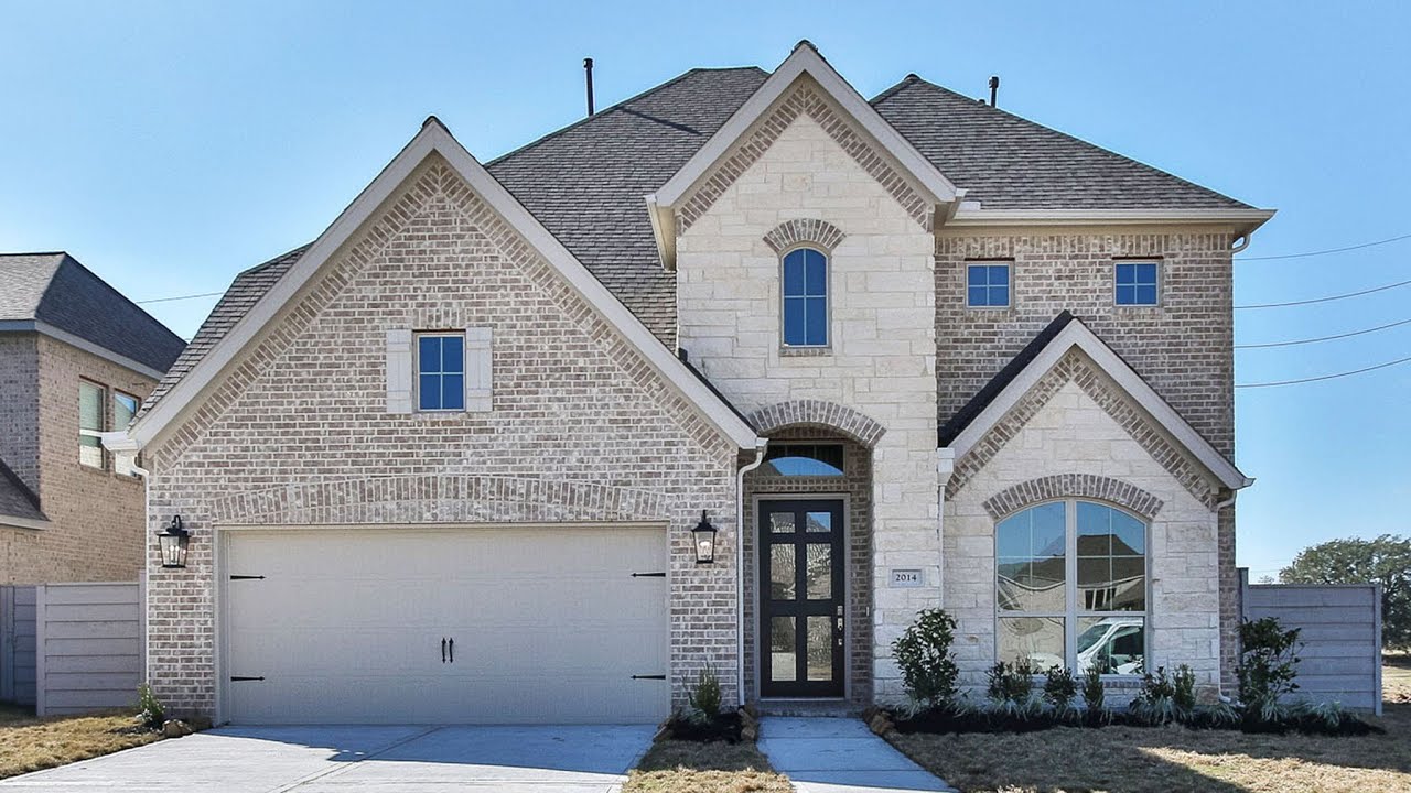 Pomona is a master-planned community of new single family homes for sale in Manvel, TX. This 3190 sq. ft. plan offers five bedrooms, four full bathrooms and one half bathroom. Home office with French doors set at two-story entry. Formal dining room. Two-story family room with a wood mantel fireplace and a wall of windows. Kitchen features an island with built-in seating space, a walk-in pantry and opens to the morning area. Private primary suite with a curved wall of windows. Primary bath includes double doors, garden tub, separate glass-enclosed shower, dual vanities, a linen closet and a large walk-in closet. Large Game room located on second floor. Secondary bedrooms, a Hollywood bath and storage closet complete the second floor. Extended covered backyard patio. Three-car garage. #perryhomes