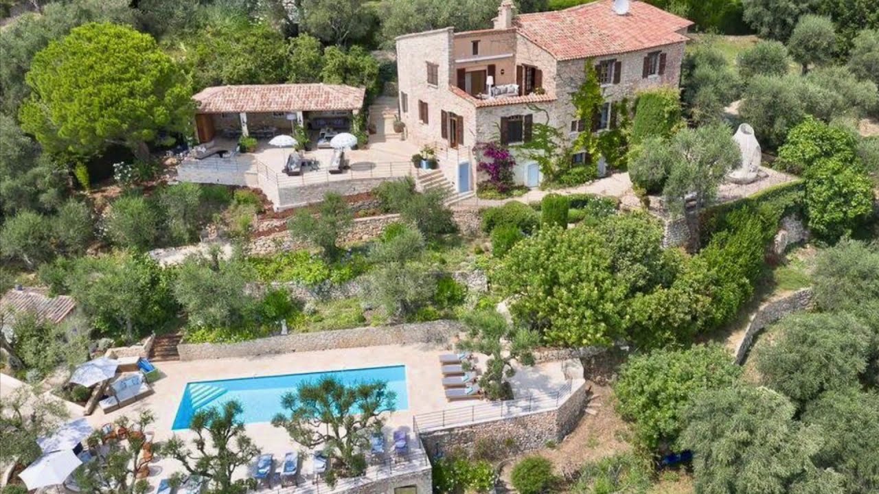 Beautiful and newly renovated 200-year-old stone holiday villa rental with 6 bedrooms, set in gorgeous surroundings with olive trees, large heated swimming pool, boules court, and stunning views to the sea, the Esterel mountains, the picturesque hilltop village of Cabris and lake Saint-Cassien.