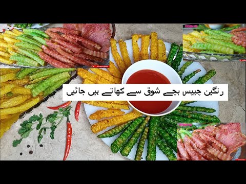 Make the perfectly colorful crispy potato chips easily at home for kids….. Flavored with salt and black pepper. we used red chilli powder or other spices too for spices lovers