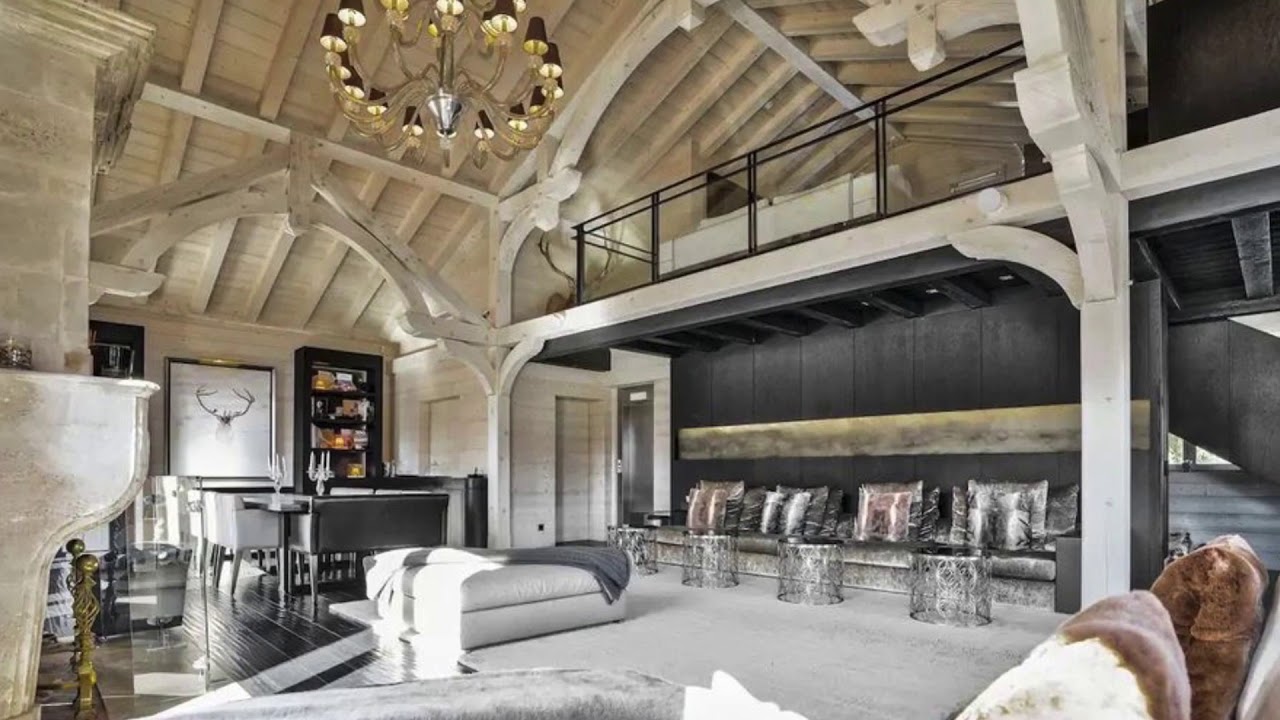 The chalet’s distinctive vaulted ceiling soars over an open-concept living and dining area, where cream-colored sofas and glam metallic accent tables are pulled around a fireplace, and the dining table seats 10.