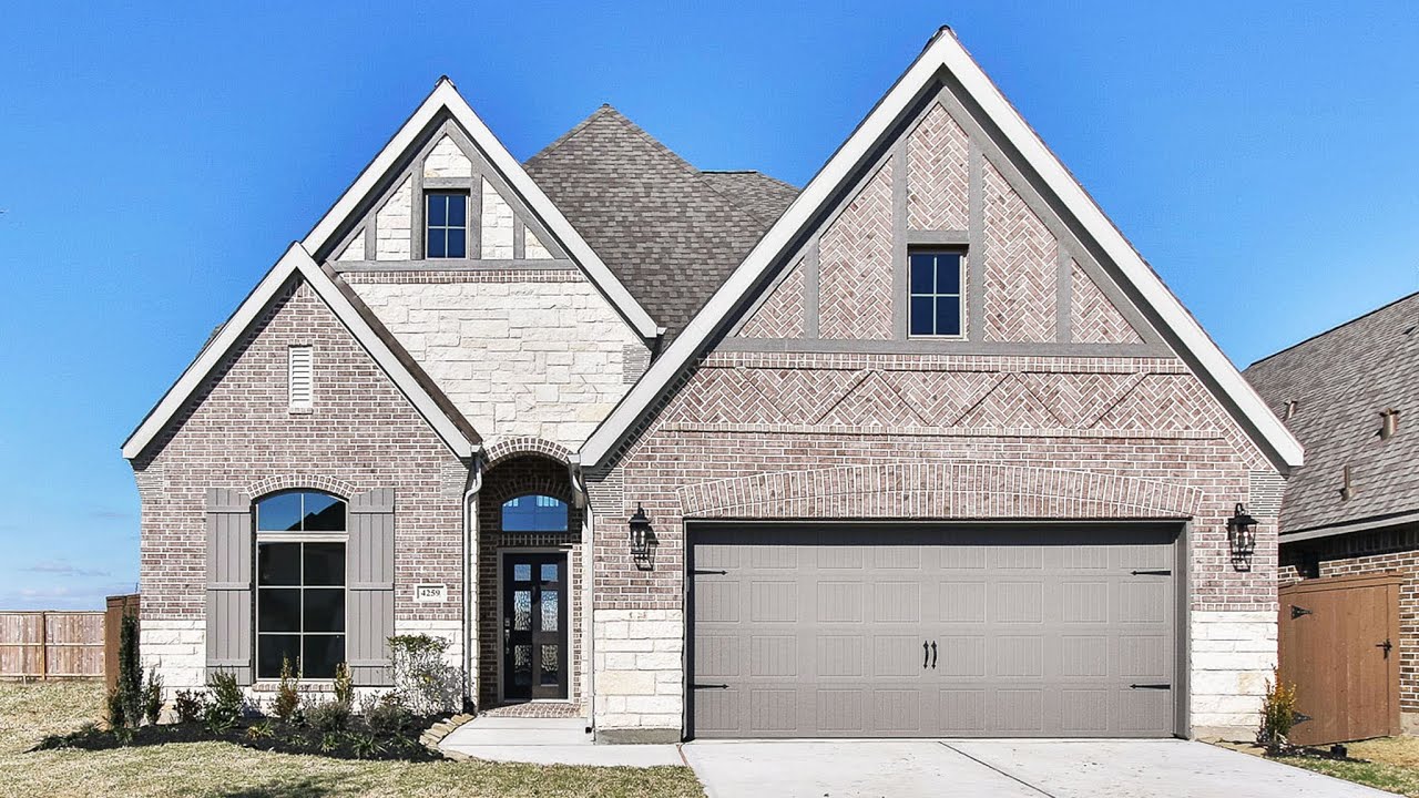 Del Bello Lakes is a new master-planned community of single family homes for sale near Pearland, TX. This 2628 sq. ft. plan offers four bedrooms and three full bathrooms. Two-story entry opens to home office with French doors. Open family room with ceramic tile floor features a wall of windows and 19-foot ceiling. Large dining room. Kitchen features island with built-in seating space. Primary bedroom. Primary bathroom features dual vanities, garden tub, glass enclosed shower and two walk-in closets. Secondary bedrooms and large game room on second level. Utility room. Covered backyard patio. Two-car garage. #perryhomes