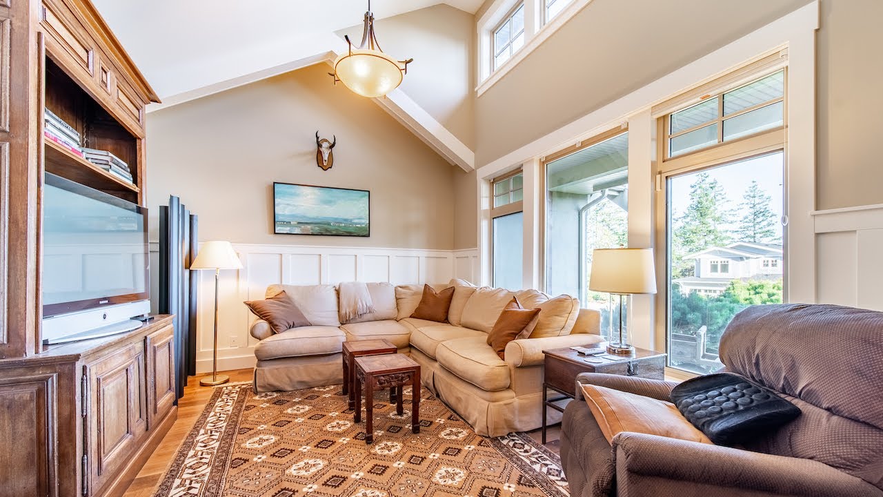 4⃣Impressive finishes include hardwood floors, natural gas fireplace w/ slate surround & built-in cabinets, 8 foot doors, 15 ft vaulted ceilings w/ exposed beams and clerestory windows making this a striking home from all angles.