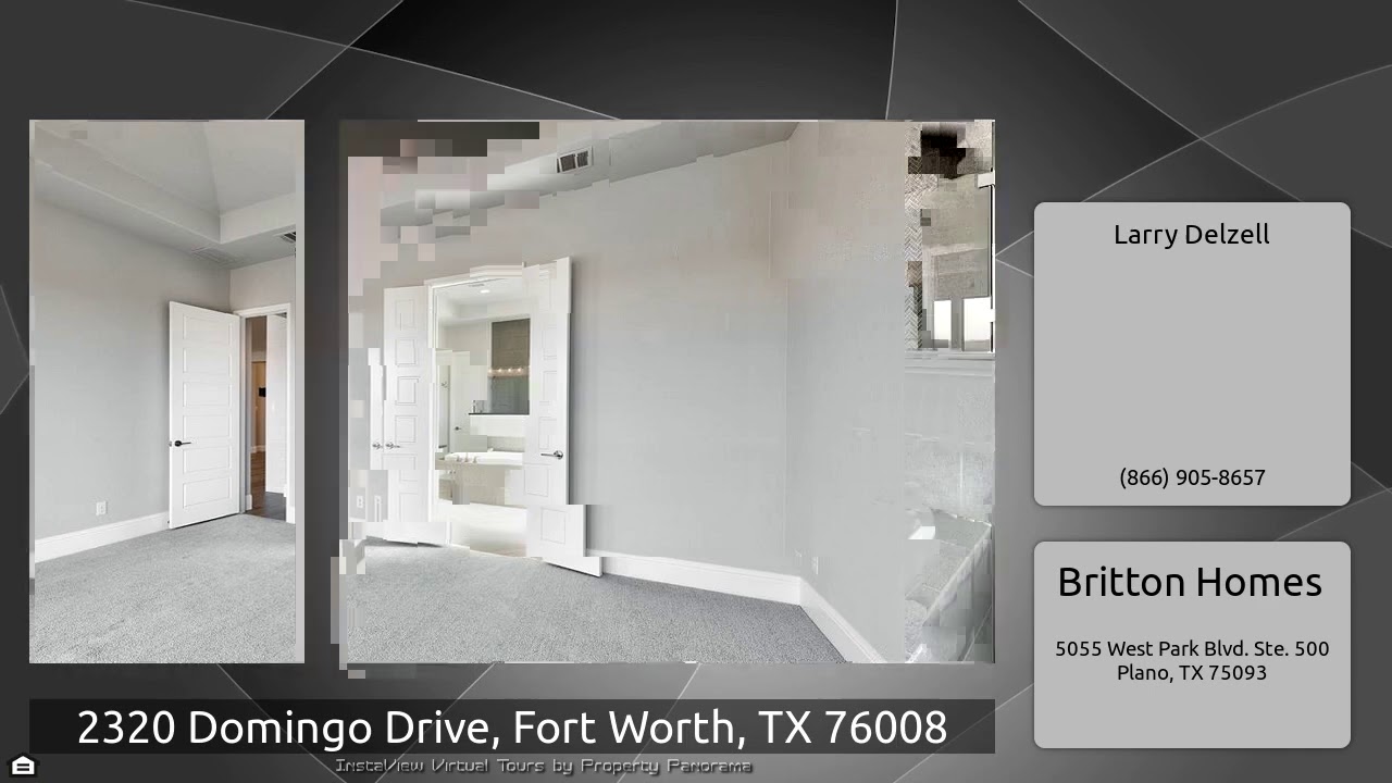 The Virtual Tour for the property at 2320 Domingo Drive, Fort Worth, TX 76008 listed for $799,900: Other homes for sale by Larry Delzell of Britton Homes: BRITTON HOMES NEW CONSTRUCTION! Home Office with French doors set at entry. Formal dining room and game room with French doors frame extended entry. Family room with sliding glass door and fireplace opens to morning area and kitchen. Kitchen hosts elongated island with built-in seating space. Primary suite includes bedroom with wall of windows. Dual vanities, garden tub, separate glass-enclosed shower and large walk-in closet in primary …