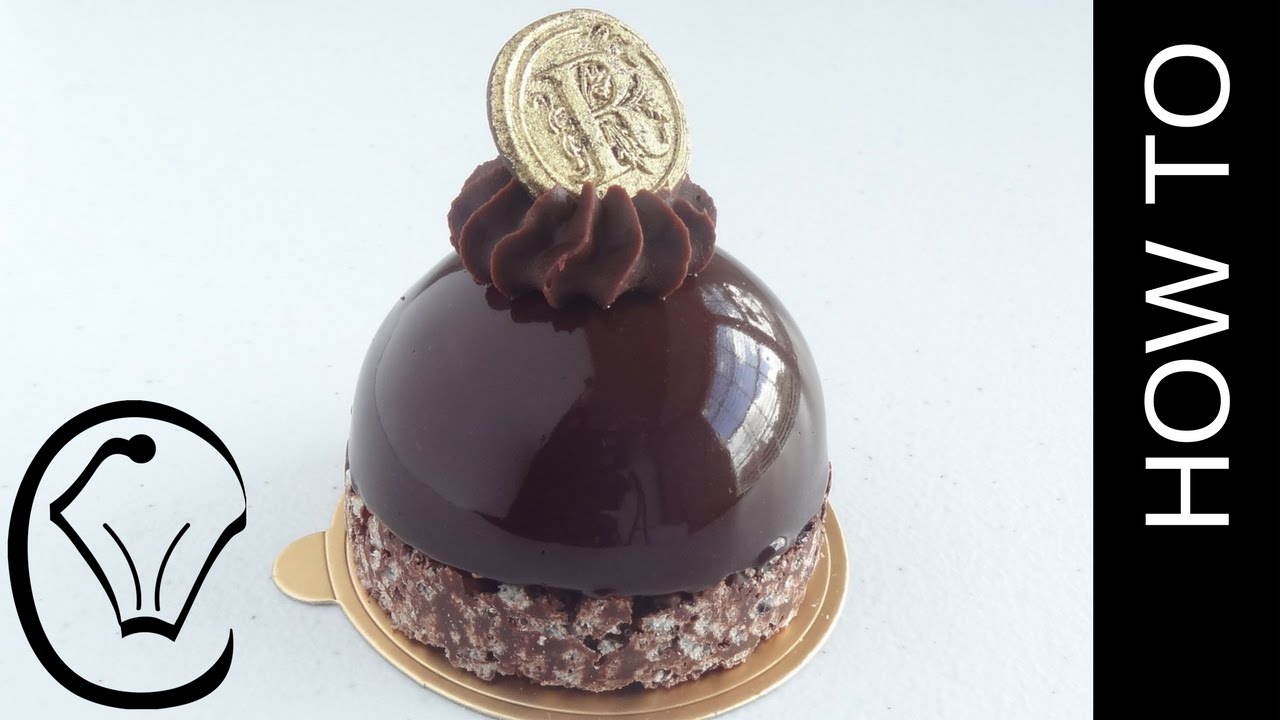 This is an unbelievably easy Entremet to make and it is super impressive with a little touch of posh! The elements used include: Dark Chocolate Mousse Dome, Shiny Chocolate Mirror Glaze, Crispy Dark Chocolate Base, piped Ganache Swirl and Gold Chocolate Monogram. When they are all put together, the result is WOW! Perfect for your next dessert buffet.