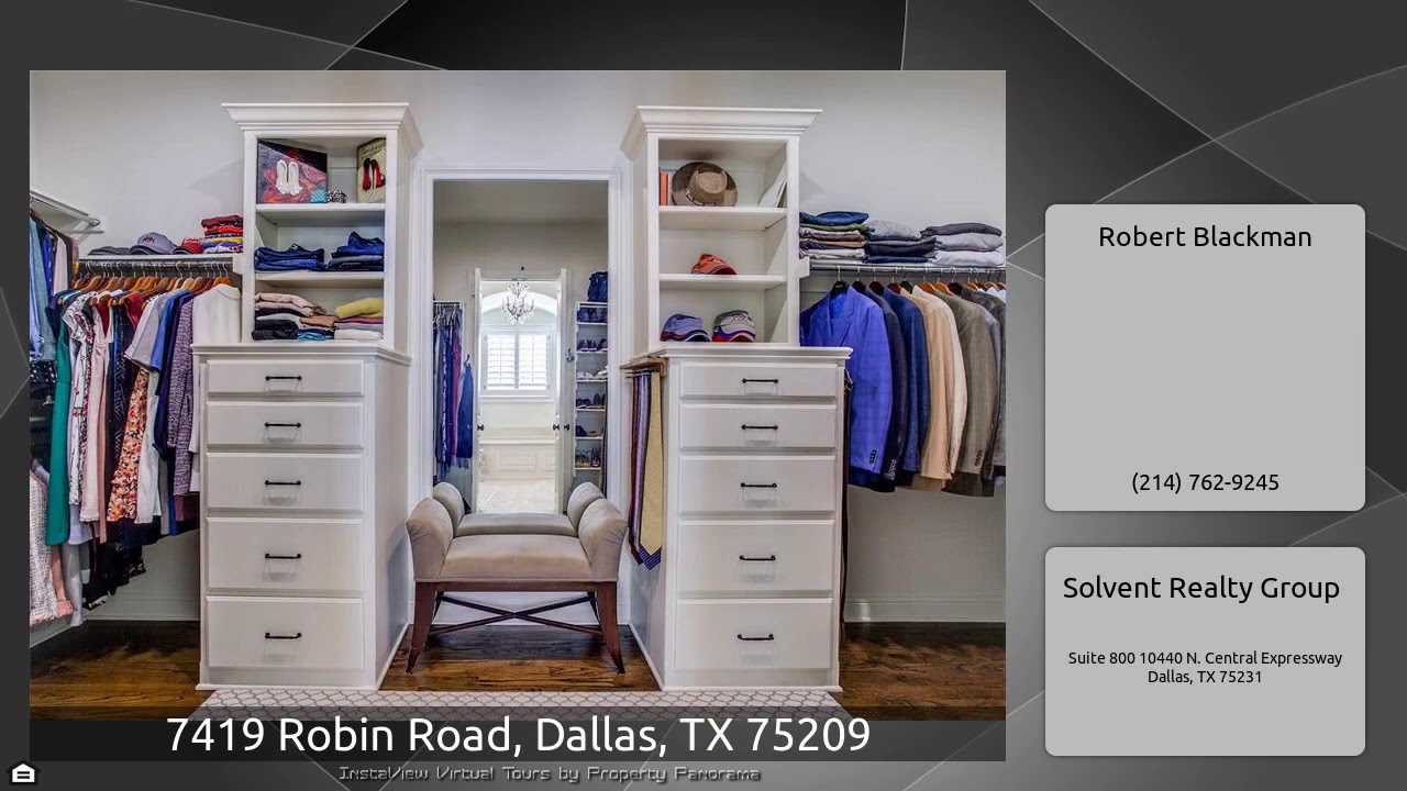 The Virtual Tour for the property at 7419 Robin Road, Dallas, TX 75209 listed for $1,549,000: Other homes for sale by Robert Blackman of Solvent Realty Group: Located within walking distance of Inwood Village shops & dining, this French-inspired transitional home sits on a corner lot with an ideal floor plan & high-end finishes throughout. From the open concept kitchen& family room you’ll feel the tranquility of the outdoor living space w relaxing pool, FP & built-in grill. Gourmet kitchen with Wolf & Sub-Zero appliances, expansive walk-in pantry & wet bar. Luxurious vaulted owner suite …