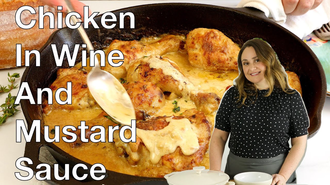If you want a little escape from the mundane, make this chicken in wine and mustard sauce! Chicken thighs and legs browned, then braised in white wine and Dijon mustard sauce with a bit of cream. #chickeninmustardsauce #chickendijon