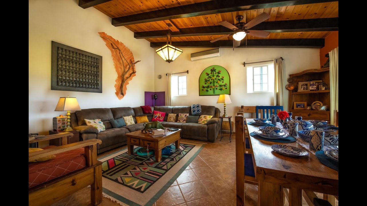 Walk up the interior staircase to the heart of the home… the main living area with a large gourmet kitchen with talavera tile and custom wood cabinets with plenty of storage. The kitchen is designed for those who love to cook and entertain and has a center island as well as a long tiled breakfast bar between the kitchen and the living and dining room. The comfortable living room and dining room has a fireplace in the corner and tall ceilings with exposed wood beams and wood paneling. There is a balcony all along the front side of house, that is the perfect spot to enjoy coffee in the mornings or a cocktail in the evenings. The primary bedroom with ensuite bath is located on this level, and has beautiful hand crafted wood built in closets and a balcony with french doors. Also on this second floor, there is a fourth room with a french door leading onto a balcony with spectacular mountain views, that is currently being used as an office, but could be an additional bedroom. There is a half bath on this floor as well.