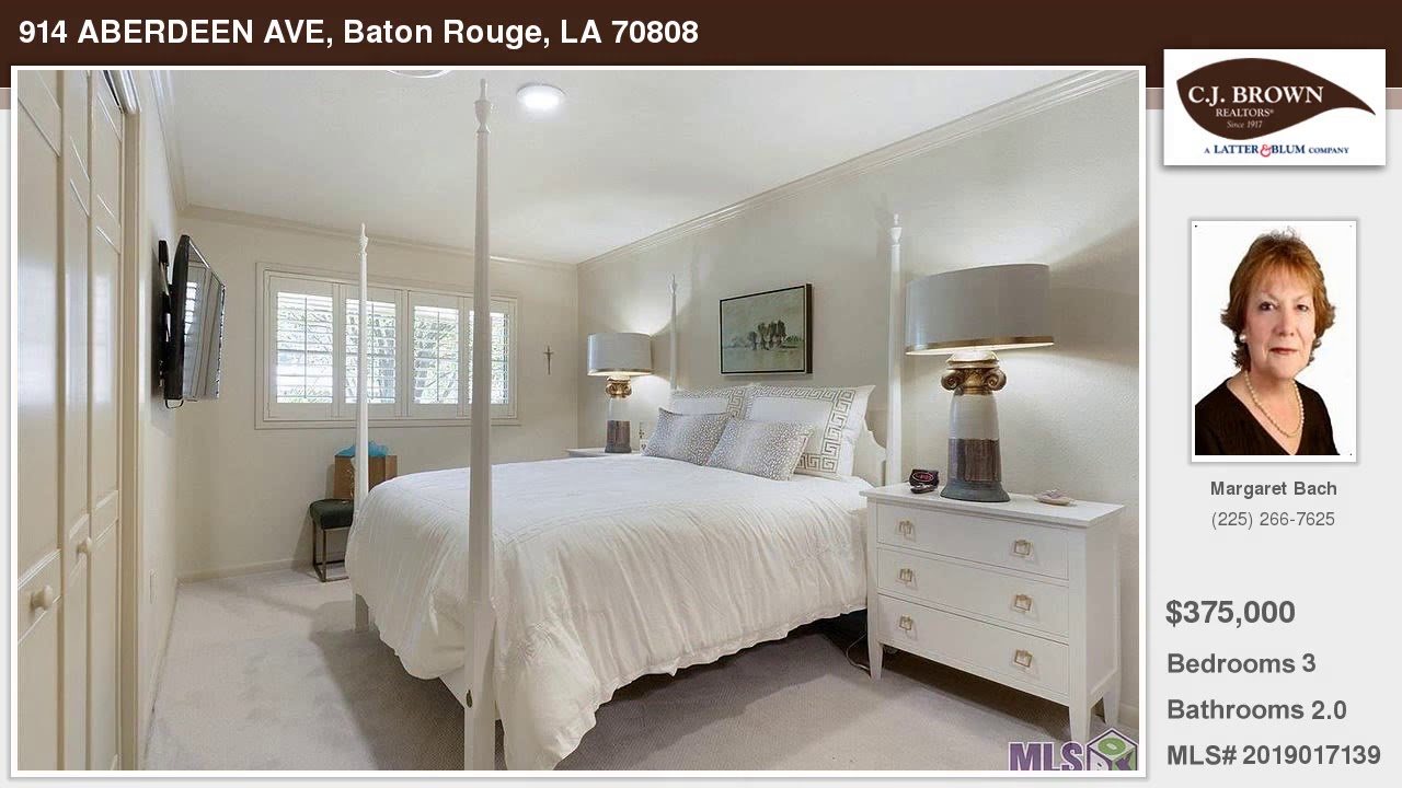 914 ABERDEEN AVE Baton Rouge Louisiana Homes for Sale | www.latter-blum.com | Margaret Bach with Latter & Blum Companies | See full property details at | Beautifully updated and maintained 3 bedroom 2 bath home in Southdowns area. Over the years there were additions by licensed architect Ike Capdevielle. Quiet neighborhood and home is on corner lot where two streets dead end. Original windows replaced with energy efficient ones. Home has lots of natural light and all windows have lovely window treatments—plantation shutters in all bedrooms and the living room, bamboo shades in formal dining room and breakfast nook, woven shades in the den. In the den there is also a gas log fireplace with a remote and French doors leading to a multi-level patio in the landscaped fully fenced backyard. Landscaping designed by LSU school of landscape architecture graduate. The yard has an underground irrigation system and a French drain. There are built-in bookcases in the living room and a lovely built-in storage and serving area in the formal dining room. Home has a whole house generator. There is a rear 2 car carport and an additional parking pad at the front. There is a security system and installed cameras. All appliances remain.