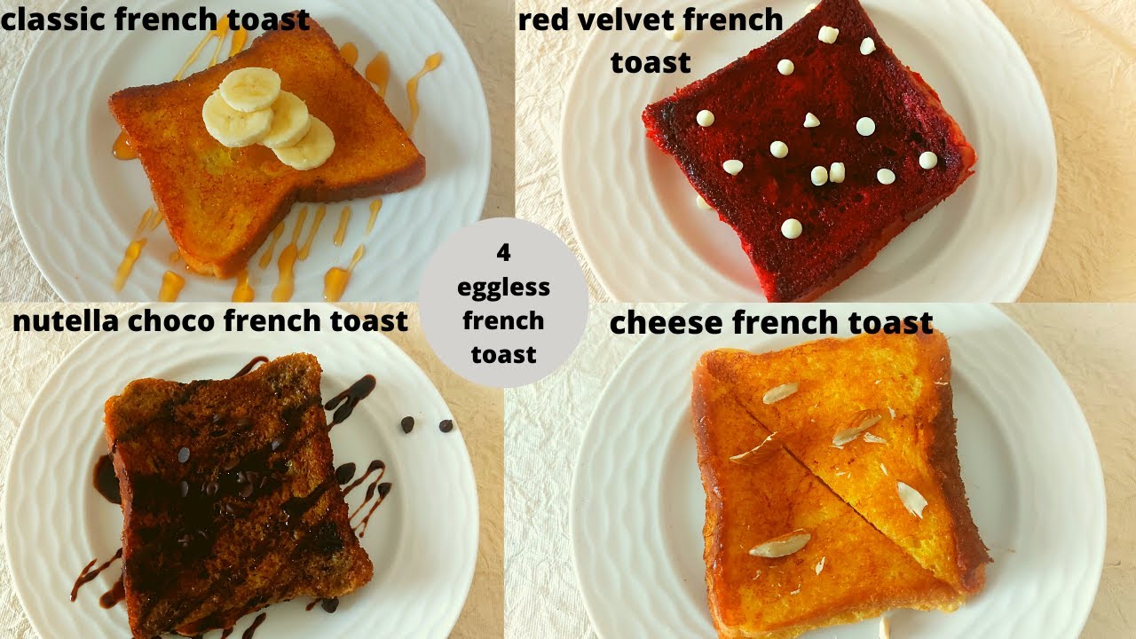 4 easy eggless French toast recipe|custard French toast recipe|no egg French toast detailed recipe and photo by SNEHAL SHRIGADIWAR. Quick and easy eggless French toast recipe, an ideal breakfast or snack recipe made with sandwich bread slices dipped in custard milk, then pan fried. In this video there are 4 variation of eggless French toast like classic French toast, cheese French toast, choco Nutella, red velvet French toast.