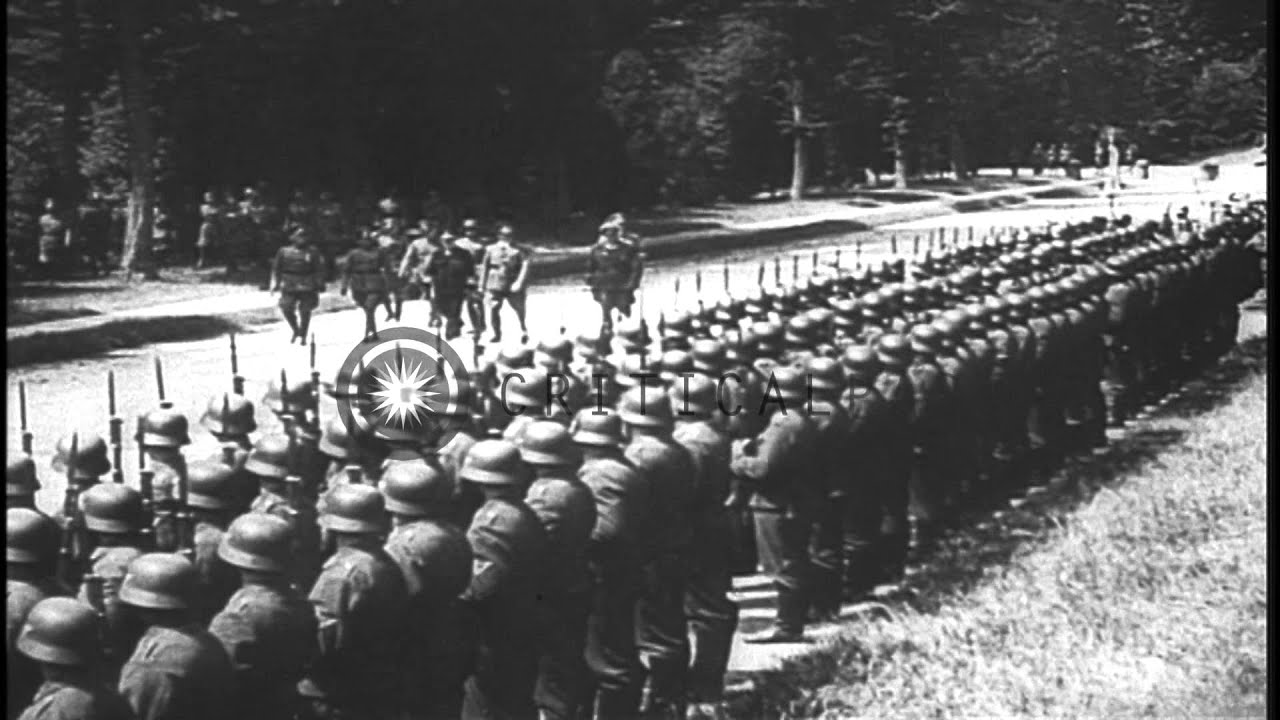 An armistice signed between the French and the Germans in Compiegne, France during World War II. A German soldier on horse back salutes. The German Army on horse back enters Paris. German troops cross the Arc de Triomphe. They march on the streets of Paris. A landscape view of Paris. German Chancellor Adolf Hitler at the Eiffel Tower near the Seine River with some officials. Hitler looks at a Nazi flag fluttering. Nazi posters and boards displayed in the streets of Paris. German troops with guns stand along a street. Ferdinand Foch’s railway carriage. French and German officials enter the railway car in the Compiegne Forest (Same railroad car where Germany signed surrender in World War I). Hitler reads the armistice. The railway car in the Compiegne Forest. The railway car reads ‘Voiture Restaurant’ which means a dining car. German and French officials get down the dining car after the armistice is signed. Adolf Hitler and German Field Marshal Wilhelm Keitel get down the car. Location: Compiegne France. Date: June 22, 1940.
