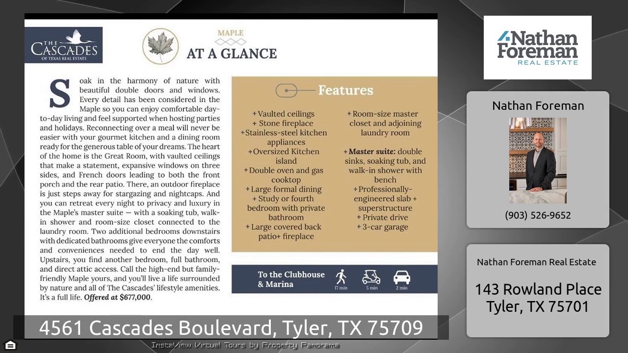 The Virtual Tour for the property at 4561 Cascades Boulevard, Tyler, TX 75709 listed for $712,600: Other homes for sale by Nathan Foreman of Nathan Foreman Real Estate: The Maple features a gourmet kitchen and a dining room ready for the table of your dreams. The heart of the home is the Great Room, with vaulted ceilings, expansive windows on three sides, and French doors leading to both the front porch and the rear patio. There, an outdoor fireplace is just steps away for stargazing and nightcaps. And you can retreat every night to privacy and luxury in the Maple’s master suite — with a …
