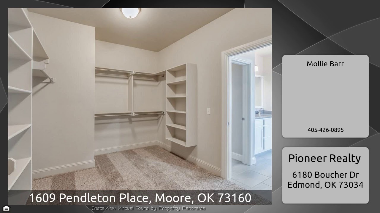 The Virtual Tour for the property at 1609 Pendleton Place, Moore, OK 73160 listed for $285,111: Other homes for sale by Mollie Barr of Pioneer Realty: 3 bed w/ study! Beautiful curb appeal welcomes you with an inviting porch entrance and a spacious 3 car garage. Upon entering the home, french doors lead into the study with a walk-in closet. The open concept living room with high ceilings, corner fireplace flows right into the kitchen and dining area, creating a wonderful gathering area for family and friends. The beautiful kitchen features quality cabinetry to the ceiling, spacious island. The …