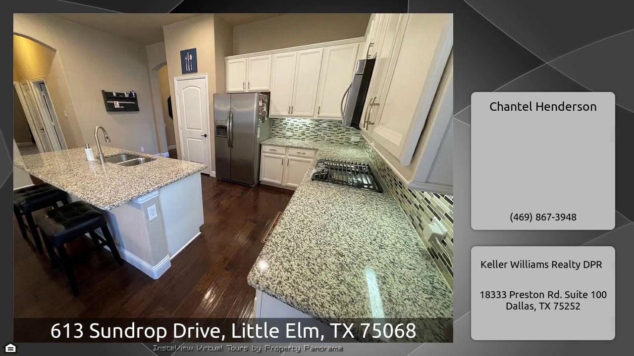 The Virtual Tour for the property at 613 Sundrop Drive, Little Elm, TX 75068 listed for $335,000: Other homes for sale by Chantel Henderson of Keller Williams Realty DPR: *MULTIPLE OFFERS RECEIVED. Sellers are calling for highest and best by 7pm Sunday 2 28.* ADORABLE, 3 bedroom 2 bath home in Frisco Hills Subdivision! Open floor plan with warm, rich wood floors throughout. Separate office complete with glass french doors. Gourmet kitchen boasting of beautiful granite countertops, designer backsplash, gas cooktop, stainless steel appliances and an oversized island! Wonderful for …