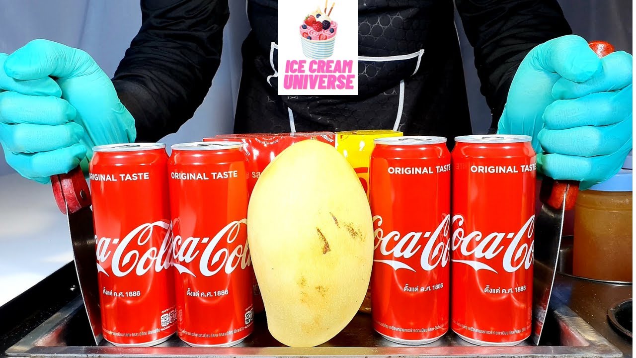 EP 166 ASMR Coca Cola Mango Ice Cream Roll | how to make ice cream with real Coca-Cola Coke – recipe and tutorial tingles with tapping & scratching | satisfying Coca-Cola Mango Ice Cream Roll ear to ear mukbang | Ice Cream Universe