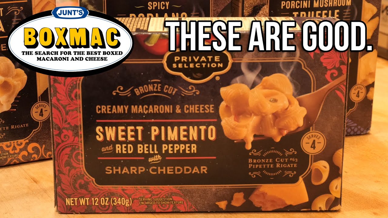 We try some fancy looking Private Selection Bronze Cut Macs, including Decadent Gouda, Truffle and Aged Cheddar, Spicy Poblano, and Sweet Pimento.