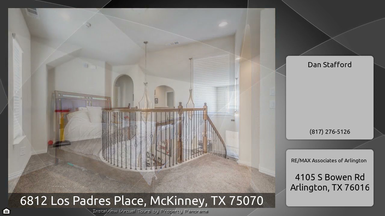The Virtual Tour for the property at 6812 Los Padres Place, McKinney, TX 75070 listed for $579,900: Other homes for sale by Dan Stafford of RE/MAX Associates of Arlington: Amazing home in prestigious Stone Hollow, kept to perfection & updated to meet the most discriminating buyer's expectations! Grand foyer leads past French door'd study, formal dining room & curved staircase w-iron balusters to inviting family room w-handscraped wood floors & open across spacious breakfast bar to gourmet kitchen w-granite c'tops, double oven, SS appliances & walk in pantry to delight the family chef! …