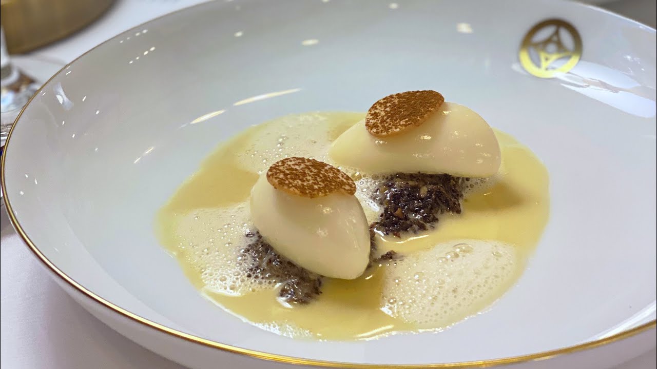 Fourth course is slow-cooked cod with spinach and scamorza soup. Cod is perfectly cooked and then seared for the crust. The cheesy sauce goes well with the fish and veg. We’ve additional shavings of white truffle which lifts this dish to another level.