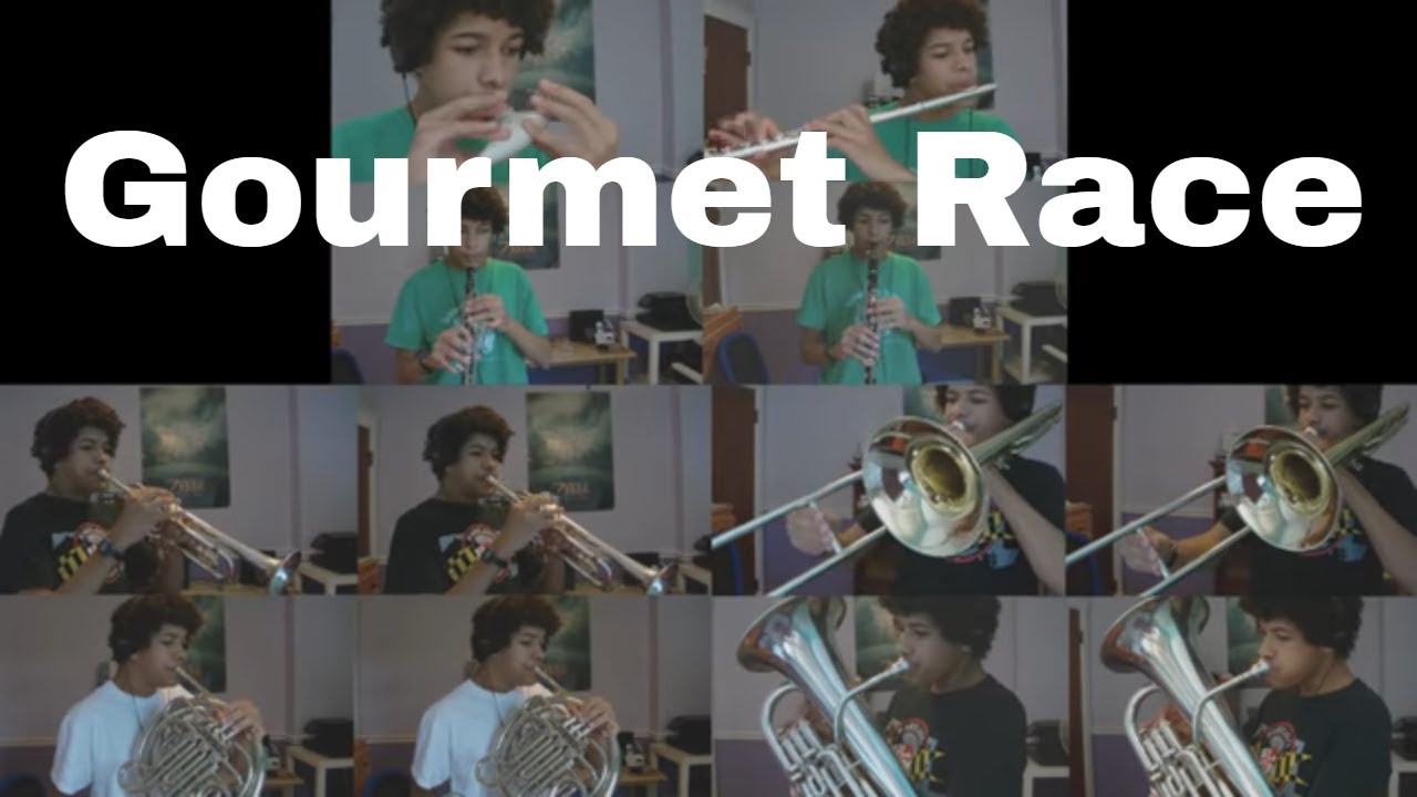 This is a video of me playing Gourmet Race from Kirby Super Star on: ocarina, flute, clarinet, oboe, 2 trumpets, 2 french horns, 2 trombones, and 2 euphoniums. The percussion (snare drum, bass drum, crash cymbals, and timpani) all comes from Finale.