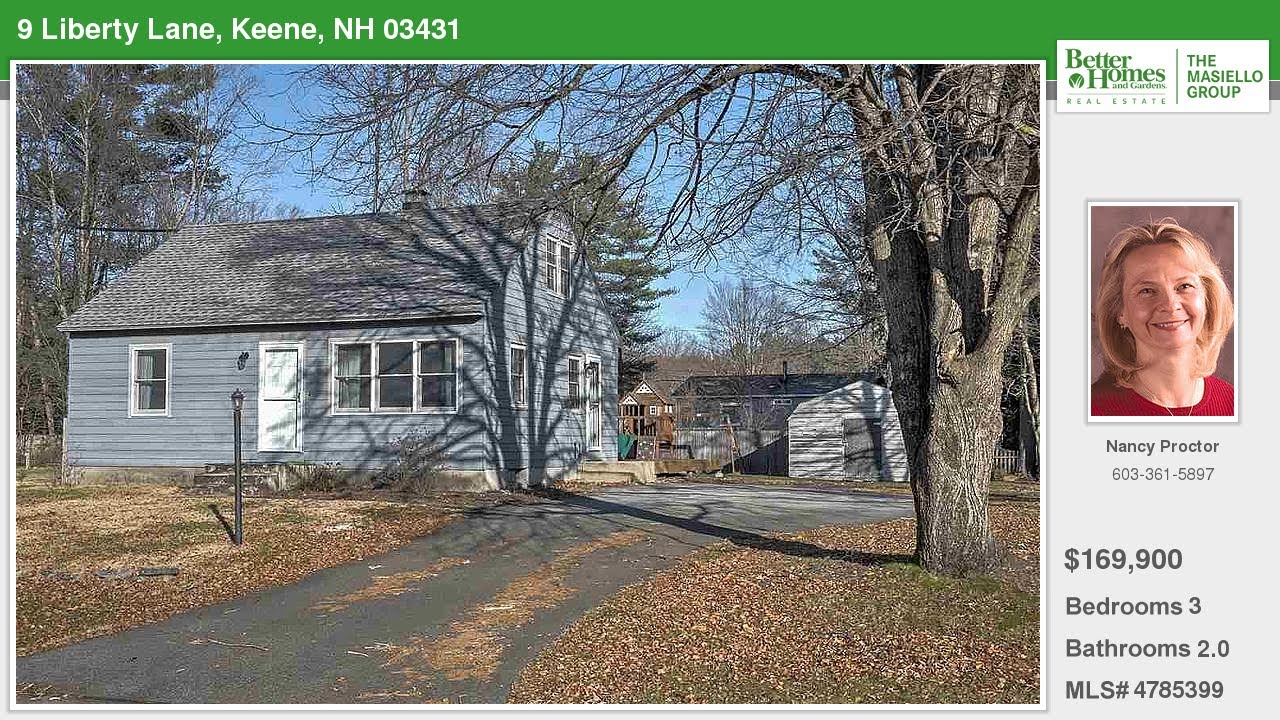 9 Liberty Lane Keene New Hampshire Homes for Sale | www.masiello.com | Nancy Proctor with Better Homes and Gardens Real Estate The Masiello Group | See full property details at | Classic New England Cape! Situated in great West Keene neighborhood, close to schools, services and YMCA. Three bedrooms and 2 baths, sunny kitchen with new countertops open to a lovely dining room with hardwood floors. First floor master bedroom suite with full bath and French doors to deck and patio area. Entertain in the spacious living room, or lower level family room which has a brick hearth and bar. New roof and replacement windows for energy efficiency. Large back yard with plenty of space for gardens or pets. Very affordable. Won't last long!